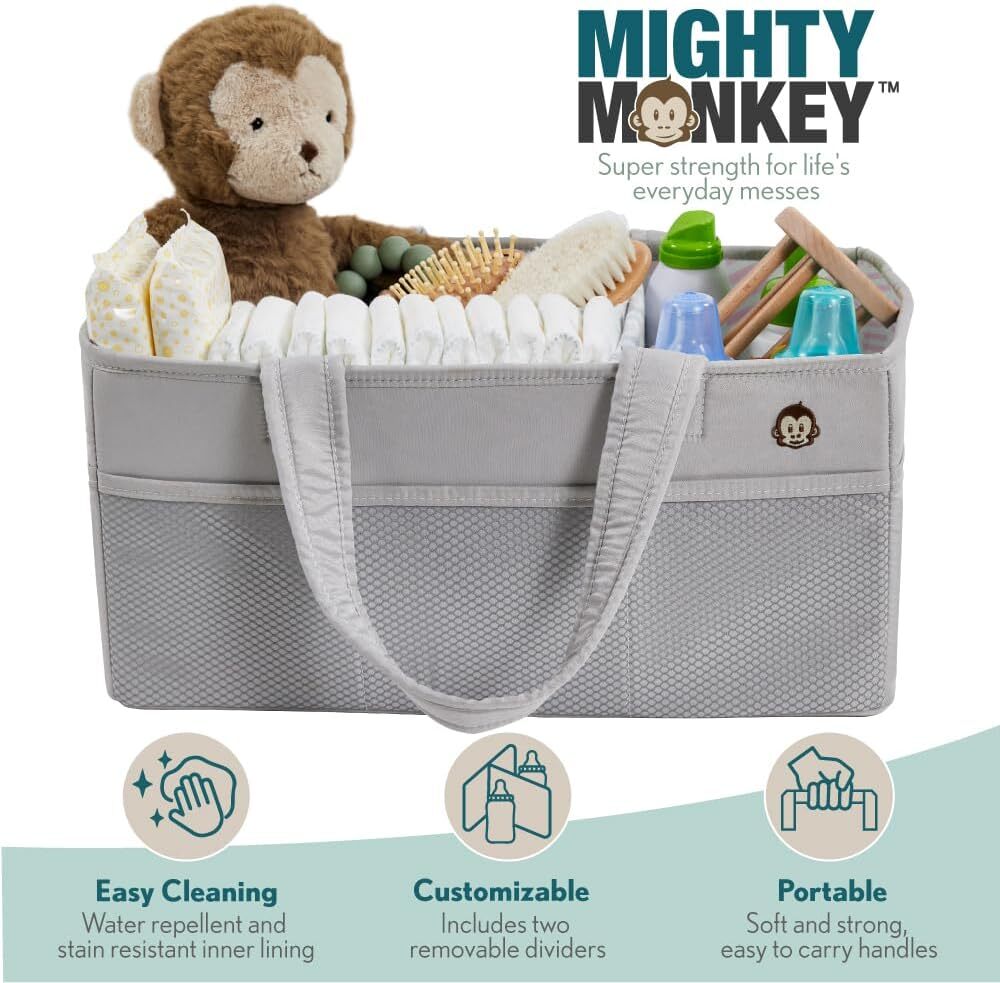 Product Details Specific Uses For Product: Baby Essentials, Diapers, Wipes Material: Polypropylene, Ethylene Vinyl Acetate Special Feature: Mesh Pockets, Water Repellent, Portable, Collapsible, Adjustable Compartments, Stain Resistant Color: Pink/Gray Brand: MIGHTY MONKEY Product Dimensions: 15"D x 10"W x 7"H Shape: Rectangular Capacity: 18 Pounds Number of Items: 1 Maximum Weight Recommendation: 18 Pounds Number of CompartmentsUnit Count: 31.0 Count LARGE CAPACITY: designed with both convenient and spacious storage; large construction measures 15 inches x 10 inches x 7 inches ensuring all baby's essentials are stored with ease; versatile compartments hold diapers, wipes, blankets, swaddles, clothes, creams and much more WATER REPELLENT AND STAIN RESISTANT: minimize diaper changing messes with water repellent, stain resistant inner lining; lining easily wipes clean, unlike felt caddies; removable inserts simplify cleaning for added convenience CUSTOMIZABLE STORAGE COMPARTMENTS: created to fit all your personal needs; includes two detachable dividers; easily arrange your caddy to up to three separate compartments for versatility all parents need PORTABLE AND EASY TO CARRY: effortlessly carry all baby essentials from room to room with oversized and comfortable handles; perfect for busy parents on the move; maximize space with caddy's foldable design; ideal for neat storage when not in use MESH POCKETS AND STRONG CONSTRUCTION: practical mesh pockets are designed for easy visibility and quick accessibility of all baby's essentials; paired with a resilient EVA foam internal structure and PP lined dividers for durability and long lasting quality