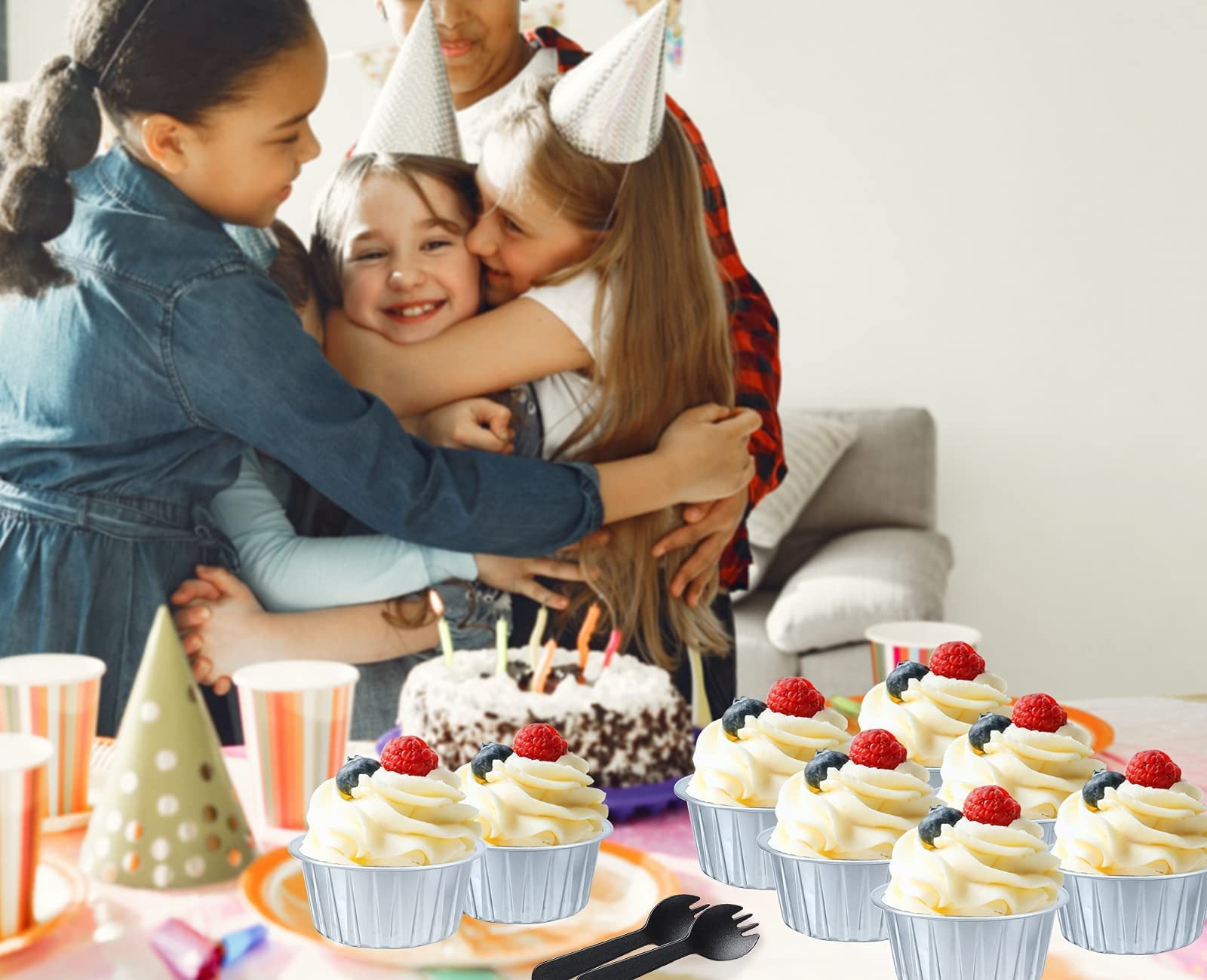 【Pack of 50 Sets】 - Including 50pcs cupcake liners with 50 matching transparent dome lids,and 50 individually wrapped spoons.Sturdy muffin cups with lids, facilitate you to carry cupcakes muffin out with no need of cupcake holders.【Mini Aluminum Foil Baking Tins】 - These jumbo muffin cups are made of food-grade aluminum foil that has excellent thermal conductivity, shortening baking time. They are oven, grill, air fryer and refrigerator safe and can withstand temperatures of up to 250℃/482℉.(NOTE:The clear lids are not heat resistant!)【5oz Cupcake Baking Cups with Lids】 - These cupcake cups size: 3.3"D x 1.5"H;The matching clear dome lid height 1.5".The tall dome cover is more suitable for adding frosting to the baked cupcake. Ideal ramekins for cupcake,muffin,mini pie, small cake,souffle, pudding, mini cheesecake,creme Brulee,custard and much more.【Easy To Use】 - This small baking tins is not easy to deform in the baking process,not only can be used as a small cupcake pan.Matching the top cover,but also a exquisite package container.without demudding and waste time washing the baking tray, you can enjoy baking more.【Wide Usage 】- These cute mini pans with lids and spoons are great for home and outdoor usage such as birthday party, wedding,baby shower,thanksgiving,Christmas and Halloween,etc.holiday celebration,And picnic, camping and other leisure activities. Also ideal for restaurants, bakery, chef,and other catering venues.