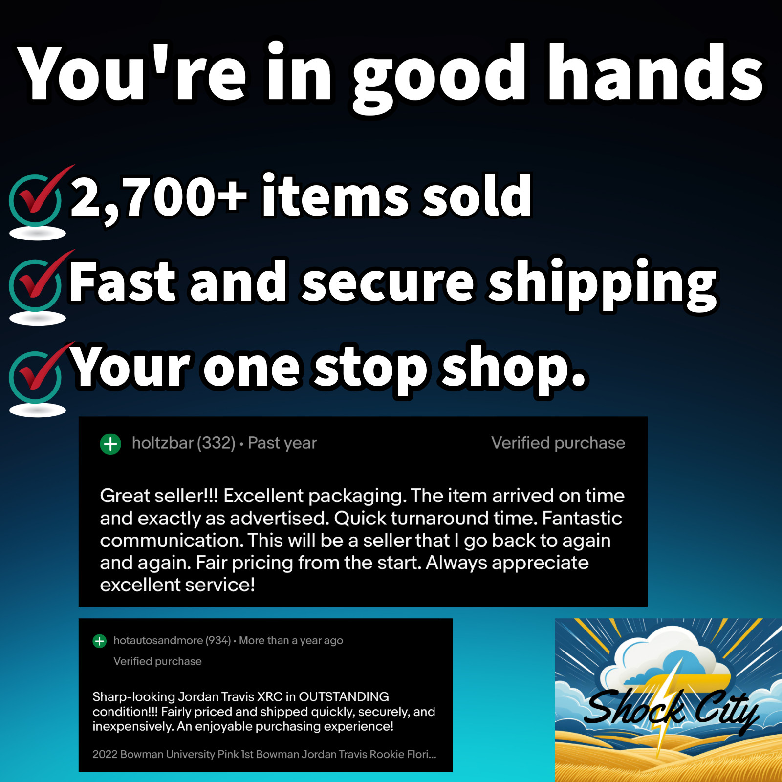 You will receive the exact cards in the scans. The scans are not stock photos—they are actual scans of the cards you will receive. Please send a message if you have any questions or read the full description. 2023 Donruss Press Proof Blue Lot 24 Football Cards Darius Slayton Giants NM NFLYou will receive the exact cards in the scans. The scans are not stock photos—they are actual scans of the cards you will receive. Please send a message if you have any questions. Overall these cards are in near-mint condition or better. Equivalent to cards fresh from the pack. Learn more about eBay's card condition guidelines here: https://pages.ebay.com/cardconditions/ Please view the scans and send a message if you have any questions about condition. Shipping DetailsShock City Cards - Shipping Policy Combined Shipping WE COMBINE SHIPPING ON CARDS! Shipping is $0.99 per additional single card with a maximum charge of $4.99. Shipping Methods All ungraded cards priced at $19.99 and less will be shipped using eBay's Standard Envelope program, protected in a semi-rigid and plastic sleeve. All cards over $20 will be shipped in a bubble envelope or better. Please be aware of these shipping terms before purchasing. If you have any questions, please reach out before purchasing. Thank you! Return PolicyShock City Cards - Return Policy Absolutely NO Returns or Cancellations. We DO NOT cancel bids or auctions for any reason. All winning items will automatically cancel after 4 days if not paid. Card Scans and Inquiries Card scans are of the actual card. Please ask any questions before purchasing or bidding, including requesting additional pictures. We DO NOT guarantee any minimum third-party grades. You may see some thin green lines in some pictures; these are scan reflections and are NOT on the cards. CHROME & PRIZM cards scan differently and may appear darker than they actually are. If you would like to see a non-scanned photo, please reach out, and we will accommodate within reason. Please consider this before buying or bidding. Thanks, and have fun! Welcome to Shock City Cards! 🚀 About Our Card Shop: At Shock City Cards, we are passionate about bringing the excitement of card collecting to enthusiasts everywhere. Whether you're a seasoned collector or just starting out, we have something for everyone! 🎴 Our Card Collection: We specialize in a wide range of collectible cards, including: Sports Cards: Baseball, basketball, football, and more! Trading Cards: Pokémon, Magic: The Gathering, Yu-Gi-Oh!, and other popular trading card games. Rare & Vintage Cards: Hard-to-find and classic cards for dedicated collectors. 🌟 Why Buy Cards From Us? Authenticity Guaranteed: We ensure that every card we sell is 100% genuine. Competitive Prices: Great deals on all your favorite cards. Customer Satisfaction: We pride ourselves on excellent customer service and a hassle-free shopping experience. 🚚 Shipping & Handling: We offer fast and secure shipping to ensure your cards arrive safely. Orders are typically processed within 1-2 business days. 💬 Customer Support: Have questions or need assistance? Feel free to reach out to us. We are here to help! Thank you for choosing Shock City Cards. Happy collecting! List of Cards Included This list was generated by AI attempting to identify the cards from the scans and it may contain errors. For some types of cards/sets the AI can be very accurate and for others it can be very bad. If you were searching for a card on this list please confirm that it is in the lot by checking the images because the images are of the exact cards you will receive. If you have any questions, please send a message. 2023 Donruss Press Proof Blue Darius Slayton New York Giants Football Card 2023 Donruss Press Proof Blue Quez Watkins Philadelphia Eagles Football Card 2023 Donruss Press Proof Blue Tyrann Mathieu New Orleans Saints Football Card 2023 Donruss Press Proof Blue Juwan Johnson New Orleans Saints Football Card 2023 Donruss Press Proof Blue Diontae Johnson Pittsburgh Steelers Football Card 2023 Donruss Press Proof Blue Jonathan Jones New England Patriots Football Card 2023 Donruss Press Proof Blue Jamal Adams Seattle Seahawks Football Card 2023 Donruss Press Proof Blue Shaquil Barrett Tampa Bay Buccaneers Football Card 2023 Donruss Press Proof Blue Jakobi Meyers Las Vegas Raiders Football Card 2023 Donruss Press Proof Blue Kee Allen Los Angeles Chargers Football Card 2023 Donruss Press Proof Blue Hassan Haskins Tennessee Titans Football Card 2023 Donruss Press Proof Blue Robert Woods Houston Texans Football Card 2023 Donruss Press Proof Blue Devin Singletary Houston Texans Football Card 2023 Donruss Press Proof Blue Quay Walker Green Bay Packers Football Card 2023 Donruss Press Proof Blue Kyle Pitts Atlanta Falcons Football Card 2023 Donruss Press Proof Blue Tanner McKee Philadelphia Eagles Rookie Card Football Card 2023 Donruss Press Proof Blue Roquan Smith Baltimore Ravens Football Card 2023 Donruss Press Proof Blue Logan Wilson Cincinnati Bengals Football Card 2023 Donruss Press Proof Blue Roschon Johnson Chicago Bears Rookie Card Football Card 2023 Donruss Press Proof Blue Marvin Jones Jr. Detroit Lions Football Card 2023 Donruss Press Proof Blue Austin Ekeler Los Angeles Chargers Football Card 2023 Donruss Press Proof Blue Shaquille Leonard Indianapolis Colts Football Card 2023 Donruss Press Proof Blue Garrett Wilson New York Jets Football Card 2023 Donruss Press Proof Blue Chris Olave New Orleans Saints Football Card