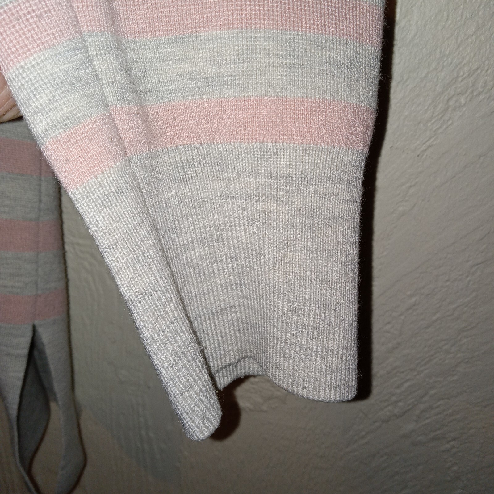 This is a Loft Ann Taylor Gray with Pink Stripes Sweater, with shoulder buttons. Heavy Sweater Pink Stripes Heather Gray Buttons at each Shoulder Ribbed Neck and Cuffs Side Slits Long Length Lose hem Acrylic 33% Polyester 26% Wool 25% Nylon 14% Spandex 2% Gently worn Approximate measurements only Length: 30" Chest: 22" x 2 = 44" Waist: 44" Sleeve Length: 19"