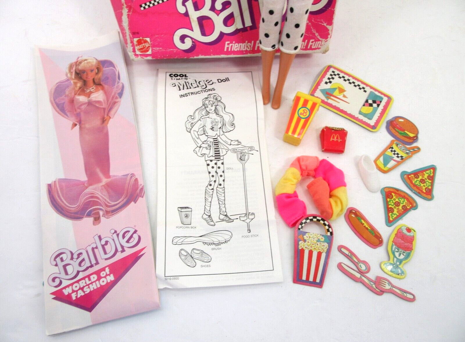Vintage 1988 Mattel Barbie Cool Times Midge Doll.Comes with all parts shown.Not complete.Missing Pogo stick & one white shoe.May be missing other parts.Includes extra cardboard fast food items.Comes with paperwork/catalog.Box is in POOR condition with tears, missing flaps.Has age/play wear.Sold as shown.
