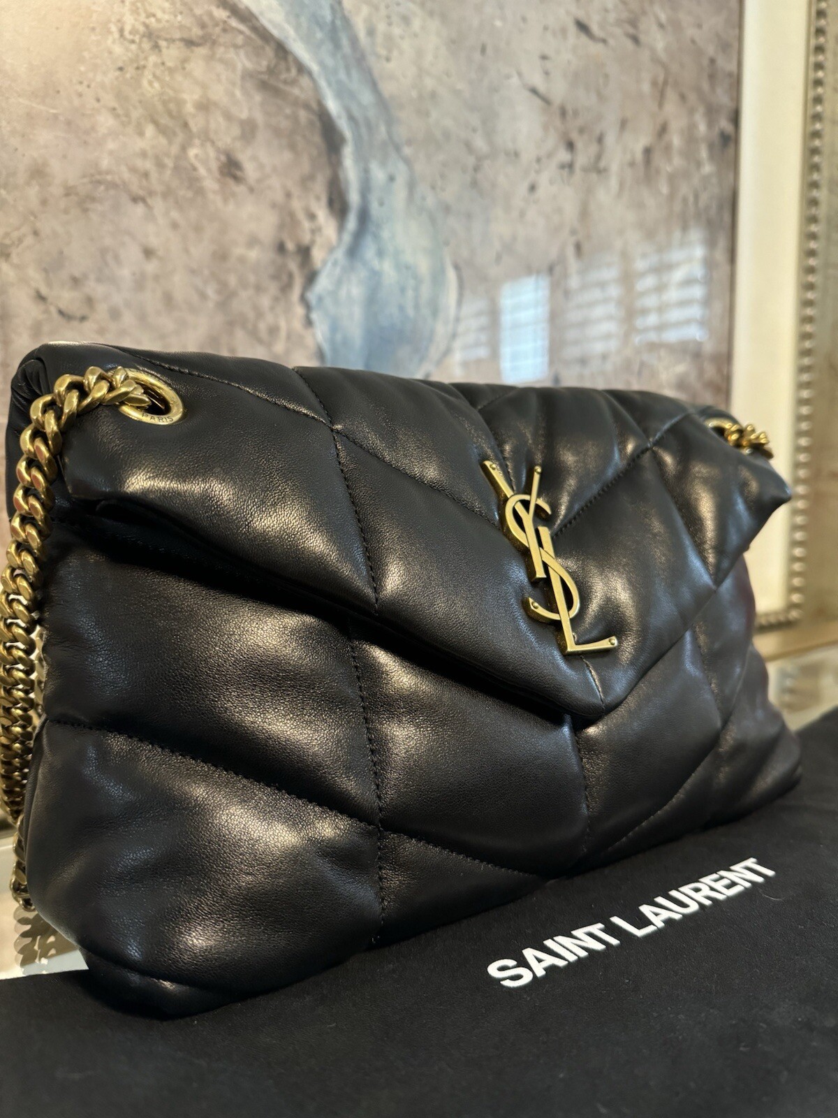 YSL Yves Saint Laurent Loulou Small Puffer Handbag Black Calfskin Leather Gold Specs