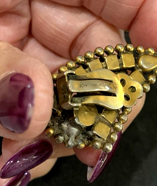 size stones. They are designed so each one curves toward the face. The gold is finished in an antique gold tone. Wear to the backs from being worn thru the years. Stones are beautifully sparkly and all present. Please see the pics. Use the zoom to fully appreciate these 1950's earrings. I have a matching bracelet running in another listing. Will combine for better shipping if you purchase both pieces. Wait for combined invoice.This will be packed carefully, boxed and sent by insured mail. SEE ALL PICTURES AS THEY ARE PART OF THE DESCRIPTION. USE THE ZOOM TO SEE DETAILS. Thank you for viewing and please take a look at my other listings.