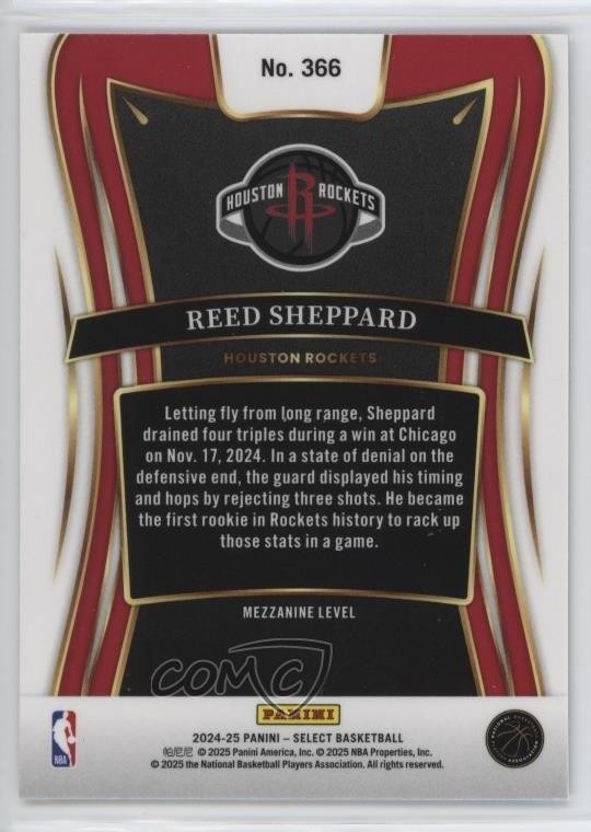 div#comcImagePanel img div#comcImages div.comcImageDisclaimer ul.comcFAQ ul.comcFAQ li div#comcProductDescription div#comcHeading div#comcLogo span.comcSpecificItem div#comcModified div.comcBlock div.comcTopic h4 div#comcContainer 2024-25 Panini Select - [Base] Mezzanine - Reed Sheppard - RC (Rookie Card) - Basketball Card - Featuring the Houston Rockets - Featuring Reed Sheppard Search for more: 2024-25 Panini Select Search for more: 2024-25 Panini Select - [Base] View all of our Listings Auctions Buy It Now About Us Located in the beautiful Pacific Northwest, COMC (Check Out My Cards) is the world's largest consignment service for trading card singles. More than 10,000 people have used our consignment service to list over 50 million trading cards. Find out how we can help you consign your items on eBay by contacting us through eBay messaging. COMC -- "The Safe & Easy Way to Buy & Sell" Representative Image - Select Specific Item above to see image of actual item Representative Image - Select Specific Item above to see image of actual item Raw Condition for Modern Cards Unless otherwise noted, raw modern cards are listed in Near Mint-Mint condition or better. A NM-MT card appears to be Mint at first glance, but upon closer inspection, may exhibit some of the following: minor print defects (e.g. roller marks, print line, dimple), minor scratches, slight edge wear, and slight corner wear. Centering is clearly visible in the images provided and does not factor into our condition assessment. Raw Condition for Vintage Cards Unless otherwise noted, raw vintage cards are listed in Excellent condition or better. An EX card may exhibit some of the following: minor rounding of corners, surface wear, print defects, light scratches, and slight edge wear/chipping. Centering is clearly visible in the images provided and does not factor into our condition assessment. Domestic Shipping Combined shipping for multiple items is available. To receive combined shipping, please ensure all desired items are in your eBay shopping cart before proceeding to checkout. eBay limits orders to 40 items per order. We automatically combine multiple orders placed on the same day. If you place multiple orders on the same day, please contact us to request a refund of applicable shipping costs. Signature confirmation may be required on invoices over $400. All cards are protected and shipped securely. International Shipping COMC offers eBay's International Shipping (EIS) for international orders under $2,500* (see country exceptions below). All duties and import fees are paid at checkout; in the rare event that there are additional import fees upon delivery, these are borne by the buyer. EIS packages route through a shipping hub in Erlanger, KY before shipping to their final destination. Please note that EIS does not allow for combined shipments. The shipping rates are determined by eBay and cannot be adjusted. *Maximum sale price exceptions: Colombia, Kuwait ($2,000); Taiwan ($1,539); Chile, Costa Rica, Guatemala, Honduras, Trinidad and Tobago ($1,000); Antigua and Barbuda, Aruba, Belize, Dominica, Grenada, Philippines, Saint Kitts and Nevis, Saint Lucia, Montserrat, Turks and Caicos Islands ($500); Dominican Republic, El Salvador ($200). Please request a shipping quote through eBay messaging for orders that exceed the maximum sale price supported by eBay's International Shipping. You will be responsible for all duties and import fees for international orders shipped outside the EIS. All cards are protected and shipped securely. Payment COMC does not accept offers on our cards through our eBay storefront. COMC utilizes eBay’s managed payments system. If you are experiencing difficulties making a payment, please contact eBay for assistance. Return Policy Returns are only accepted on the rare occasion the item is not as described. If you are making a return, please initiate the return process through eBay so a mailing label can be provided for you. Prior to listing, our expert team carefully assessed this item to represent it accurately. Please review the description and high-definition images prior to purchasing to ensure this item meets your satisfaction. We welcome you to contact us if you have further questions about this item. Trust and Integrity COMC carefully assesses each item consigned to us to prevent fraudulent items from entering the marketplace. If you believe an item offered on COMC may be fraudulent, please contact us with details so we can investigate the issue. Items we determine are outside our supported items policy may be removed. Last Modified: 10/25/2025 6:18:35 AM PDT