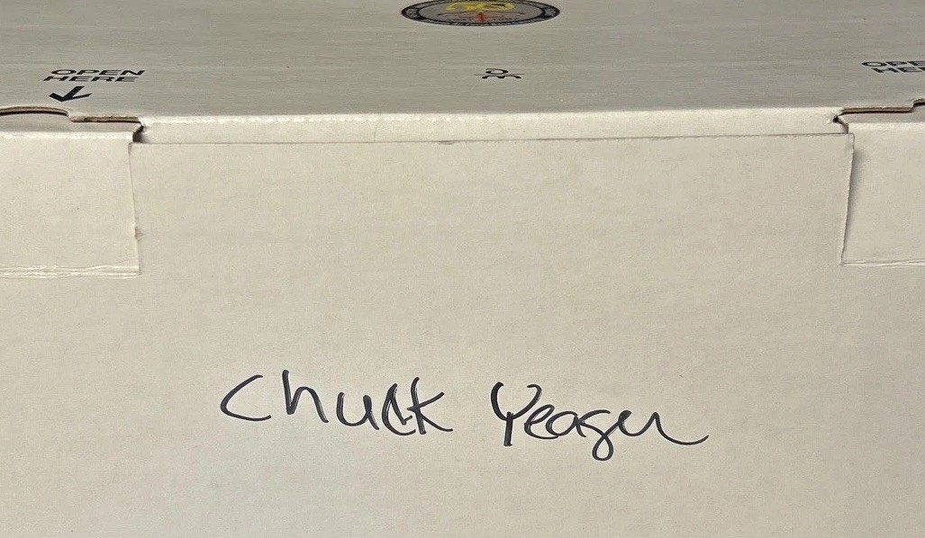 Danbury Mint Autographed F-15 Chuck Yeager's F-15 Eagle W/Box. In very good condition with a few light stains on the bottom of the plane. There is some sticker residue and water damage on the box which did not reach the plane. There are a few small scratches in the bottom of the stand. The inner foam is not damaged. Please see pictures for more details.