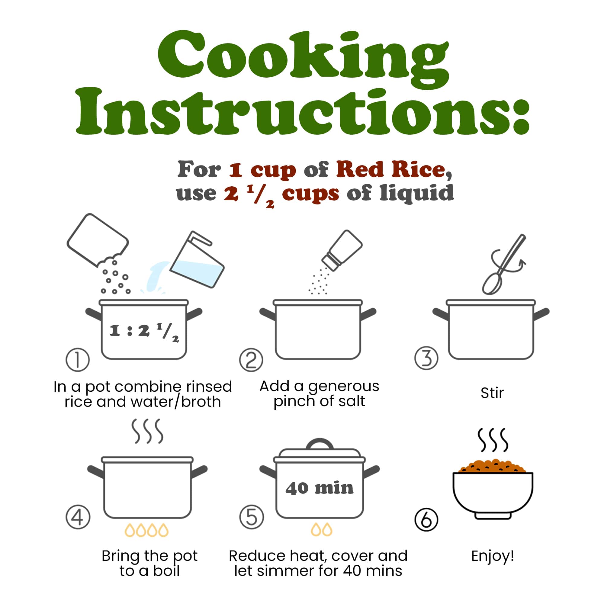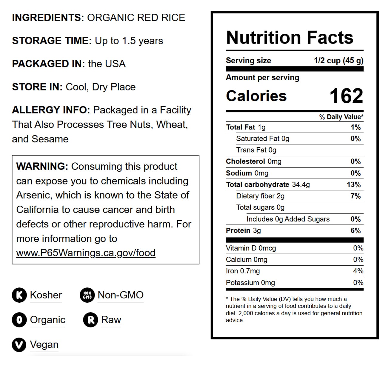 color due to a compound called anthocyanin. Red rice contains a higher amount of nutrients than white, but it also comes at a slightly higher cost. Organic red rice retains the essential components: the bran layer and the cereal germ. This product contains Vitamin B1 & B2, calcium, magnesium, and potassium. Red rice is russet-colored, nutrient-rich. Moreover, it is a perfect addition to your daily diet as it is a whole grain. Taste and Dishes of Red Rice Red rice works well with lots of foods, and it can be eaten by itself. A distinctive feature of red rice is its soft shell and pleasant, slightly sweet taste; You should make risotto. One of the main advantages of this type of rice is the unhusked shell that is good for digestion. Dishes are crunchy, delicious, with a light nutty aroma. Health gurus are in love with this grain, as well as fitness fans since its high fiber content helps lose weight. How to Cook Red Rice Recipes made of red rice are of high demand. This is a perfect recipe that will satiate your taste buds: • Wash the red rice in a pan three times and soak the rice in water for one hour. • Drain the soaked rice and transfer it to a pressure cooker. • Add 1 part of rice to 2 parts of water and place this in a pressure cooker • Cook the rice on a high flame for one whistle. • Lower the flame and cook for three more whistles. • Allow the pressure to release naturally. WARNING: Consuming this product can expose you to chemicals including Arsenic, which is known to the State of California to cause cancer and birth defects or other reproductive harm. For more information go to www.P65Warnings.ca.gov/food
