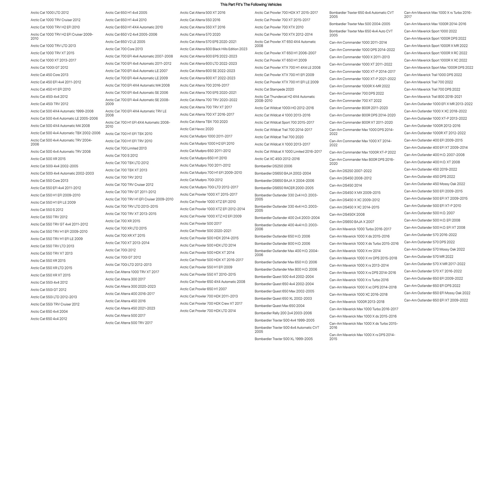 ,.subheader-wrapper, ,.right-col,.creditlink,.footer-wrapper,.boxcontent,#ns_copyright,.topbar, ,#tabs, ,#tab2,#tab3,#tab4,#tab5, , , ,#backup Tires & Wheels Parts & Accessories Casual Riding Gear Body Drive All Items See our eBay store for more great items >> Shop CategoriesCasualParts & AccessoriesBodyDriveTires and WheelsRiding Gear Tusk High Pressure Radiator Cap 1.6 For SUZUKI LT500 QUADRACER 1987-1990 Item Description Special Notes:Does not fit KTM's.The Tusk High Pressure Radiator Cap is the simplest and most inexpensive way to reduce your motorcycle or ATV from boiling over. The Tusk High Pressure Radiator cap raises your cooling system’s maximum operating pressure and therefore raises the boiling point of your coolant. This is a perfect upgrade for most motorcycle and ATV radiators with stock caps. Higher pressure radiator cap increases the boiling point of your coolant to reduce boil over problems on your motorcycle or ATV. Perfect for 4-stroke and 2-stroke motorcycles, ATV’s, and UTV’s. Raises the boiling point by 25 degrees when going from a stock 1.1 kg/cm2 (15.7 psi) radiator cap to the Tusk 1.6 kg/cm2 (22.8 psi) radiator cap. Also Fits ARCTIC CAT 1000 LTD 2012 ARCTIC CAT 1000 TRV CRUISER 2012 ARCTIC CAT 1000 TRV H2 EFI 2010 ARCTIC CAT 1000 TRV H2 EFI CRUISER 2009-2010 ARCTIC CAT 1000 TRV LTD 2013 ARCTIC CAT 1000 TRV XT 2015 ARCTIC CAT 1000 XT 2013-2017 ARCTIC CAT 1000I GT 2012 ARCTIC CAT 450 CORE 2013 ARCTIC CAT 450 EFI 4X4 2011-2012 ARCTIC CAT 450 H1 EFI 2010 ARCTIC CAT 450I 4X4 2012 ARCTIC CAT 450I TRV 2012 ARCTIC CAT 500 4X4 AUTOMATIC 1999-2008 ARCTIC CAT 500 4X4 AUTOMATIC LE 2005-2006 ARCTIC CAT 500 4X4 AUTOMATIC M4 2008 ARCTIC CAT 500 4X4 AUTOMATIC TBX 2002-2006 ARCTIC CAT 500 4X4 AUTOMATIC TRV 2004-2006,2008 ARCTIC CAT 500 XR 2015 ARCTIC CAT 500I 4X4 2002-2005 ARCTIC CAT 500I 4X4 AUTOMATIC 2002-2003 ARCTIC CAT 550 CORE 2013 ARCTIC CAT 550 EFI 4X4 2011-2012 ARCTIC CAT 550 H1 EFI 2009-2010 ARCTIC CAT 550 H1 EFI LE 2009 ARCTIC CAT 550 S 2012 ARCTIC CAT 550 TRV 2012 ARCTIC CAT 550 TRV GT 4X4 2011-2012 ARCTIC CAT 550 TRV H1 EFI 2009-2010 ARCTIC CAT 550 TRV H1 EFI LE 2009 ARCTIC CAT 550 TRV LTD 2013 ARCTIC CAT 550 TRV XT 2013 ARCTIC CAT 550 XR 2015 ARCTIC CAT 550 XR LTD 2015 ARCTIC CAT 550 XR XT 2015 ARCTIC CAT 550I 4X4 2012 ARCTIC CAT 550I GT 2012 ARCTIC CAT 550I LTD 2012-2013 ARCTIC CAT 550I TRV CRUISER 2012 ARCTIC CAT 650 4X4 2004,2012 ARCTIC CAT 650 H1 4X4 2005,2010 ARCTIC CAT 650 H1 4X4 AUTOMATIC 2010 ARCTIC CAT 650 V2 4X4 2005-2006 ARCTIC CAT 650 V2 LE 2005 ARCTIC CAT 700 CORE 2013 ARCTIC CAT 700 EFI 4X4 AUTOMATIC 2007-2008,2011-2012 ARCTIC CAT 700 EFI 4X4 AUTOMATIC LE 2007,2009 ARCTIC CAT 700 EFI 4X4 AUTOMATIC M4 2008 ARCTIC CAT 700 EFI 4X4 AUTOMATIC SE 2006,2008-2009 ARCTIC CAT 700 EFI 4X4 AUTOMATIC TRV LE 2008 ARCTIC CAT 700 H1 EFI 4X4 AUTOMATIC 2008-2010 ARCTIC CAT 700 H1 EFI TBX 2010 ARCTIC CAT 700 H1 EFI TRV 2010 ARCTIC CAT 700 LIMITED 2013 ARCTIC CAT 700 S 2012 ARCTIC CAT 700 TBX LTD 2012 ARCTIC CAT 700 TBX XT 2013 ARCTIC CAT 700 TRV 2012 ARCTIC CAT 700 TRV CRUISER 2012 ARCTIC CAT 700 TRV GT 2011-2012 ARCTIC CAT 700 TRV H1 EFI CRUISER 2009-2010 ARCTIC CAT 700 TRV LTD 2013-2015 ARCTIC CAT 700 TRV XT 2013-2015 ARCTIC CAT 700 XR 2015 ARCTIC CAT 700 XR LTD 2015 ARCTIC CAT 700 XR XT 2015 ARCTIC CAT 700 XT 2013-2014 ARCTIC CAT 700I 2012 ARCTIC CAT 700I GT 2012 ARCTIC CAT 700I LTD 2012-2013 ARCTIC CAT ALTERRA 1000 TRV XT 2017 ARCTIC CAT ALTERRA 300 2017,2020-2023 ARCTIC CAT ALTERRA 400 2016-2017 ARCTIC CAT ALTERRA 450 2016,2021-2023 ARCTIC CAT ALTERRA 500 2017 ARCTIC CAT ALTERRA 500 TRV 2017 ARCTIC CAT ALTERRA 500 XT 2016 ARCTIC CAT ALTERRA 550 2016 ARCTIC CAT ALTERRA 550 XT 2016 ARCTIC CAT ALTERRA 570 2020 ARCTIC CAT ALTERRA 570 EPS 2020-2021 ARCTIC CAT ALTERRA 600 BLACK HILLS EDITION 2023 ARCTIC CAT ALTERRA 600 EPS 2022-2023 ARCTIC CAT ALTERRA 600 LTD 2022-2023 ARCTIC CAT ALTERRA 600 MUD PRO 2023 ARCTIC CAT ALTERRA 600 SE 2022-2023 ARCTIC CAT ALTERRA 600 TRV EPS 2023 ARCTIC CAT ALTERRA 600 TRV LTD 2023 ARCTIC CAT ALTERRA 600 TRV XT 2023 ARCTIC CAT ALTERRA 600 XT 2022-2023 ARCTIC CAT ALTERRA 700 2016-2017 ARCTIC CAT ALTERRA 700 EPS 2020-2021 ARCTIC CAT ALTERRA 700 TRV 2020-2022 ARCTIC CAT ALTERRA 700 TRV XT 2017 ARCTIC CAT ALTERRA 700 XT 2016-2017 ARCTIC CAT ALTERRA TBX 700 2020 ARCTIC CAT HAVOC 2020 ARCTIC CAT MUDPRO 1000 2011-2017 ARCTIC CAT MUDPRO 1000 H2 EFI 2010 ARCTIC CAT MUDPRO 650 2011-2012 ARCTIC CAT MUDPRO 650 H1 2010 ARCTIC CAT MUDPRO 700 2011-2012 ARCTIC CAT MUDPRO 700 H1 EFI 2009-2010 ARCTIC CAT MUDPRO 700I 2012 ARCTIC CAT MUDPRO 700I LTD 2012-2017 ARCTIC CAT PROWLER 1000 XT 2015-2017 ARCTIC CAT PROWLER 1000 XTZ EFI 2010,2012-2014 ARCTIC CAT PROWLER 1000 XTZ H2 EFI 2009 ARCTIC CAT PROWLER 500 2017,2020-2021 ARCTIC CAT PROWLER 500 HDX 2014-2015 ARCTIC CAT PROWLER 500 HDX LTD 2014 ARCTIC CAT PROWLER 500 HDX XT 2014,2016-2017 ARCTIC CAT PROWLER 550 H1 EFI 2009 ARCTIC CAT PROWLER 550 XT 2010-2015 ARCTIC CAT PROWLER 650 4X4 AUTOMATIC 2008 ARCTIC CAT PROWLER 650 H1 2007 ARCTIC CAT PROWLER 700 HDX 2011-2013 ARCTIC CAT PROWLER 700 HDX CREW XT 2017 ARCTIC CAT PROWLER 700 HDX LTD 2014 ARCTIC CAT PROWLER 700 HDX XT 2015-2017 ARCTIC CAT PROWLER 700 XT 2015-2017 ARCTIC CAT PROWLER 700 XTX 2010,2012-2014 ARCTIC CAT PROWLER XT 650 4X4 AUTOMATIC 2008 ARCTIC CAT PROWLER XT 650 H1 2006-2007,2009 ARCTIC CAT PROWLER XTX 700 H1 4X4 LE 2008 ARCTIC CAT PROWLER XTX 700 H1 EFI 2009 ARCTIC CAT PROWLER XTX 700 H1 EFI LE 2009 ARCTIC CAT STAMPEDE 2020 ARCTIC CAT THUNDERCAT H2 4X4 AUTOMATIC 2008-2010 ARCTIC CAT WILDCAT 1000I HO 2012-2016 ARCTIC CAT WILDCAT 4 1000 2013-2016 ARCTIC CAT WILDCAT SPORT 700 2015-2017 ARCTIC CAT WILDCAT TRAIL 700 2014-2017,2020 ARCTIC CAT WILDCAT X 1000 2013-2017 ARCTIC CAT WILDCAT X 1000 LIMITED 2016-2017 ARCTIC CAT XC 450I 2012-2016 BOMBARDIER DS250 2006 BOMBARDIER DS650 BAJA 2002-2004 BOMBARDIER DS650 BAJA X 2004-2006 BOMBARDIER DS650 RACER 2000-2005 BOMBARDIER OUTLANDER 330 2X4 H.O. 2003-2005 BOMBARDIER OUTLANDER 330 4X4 H.O. 2003-2005 BOMBARDIER