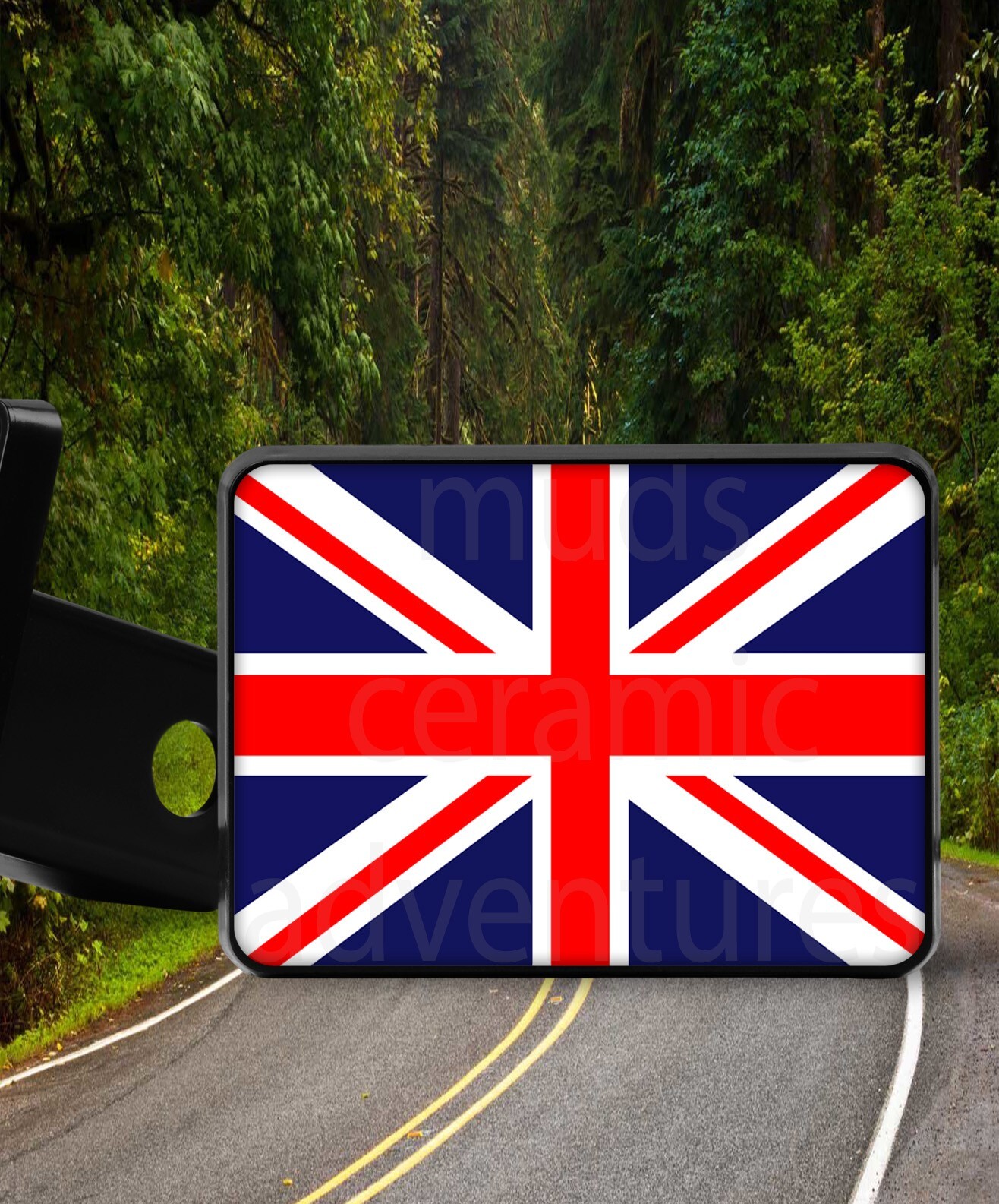 FYI : All our trailer hitch covers are American Made. -------------------------------------------------------------------------------------------------- England Great Britian British flag style Trailer Hitch Cover plug Fits 2" receiverHitch pin not includedDurable Gloss Black PlasticApprox 4" x 5" face sizeImage