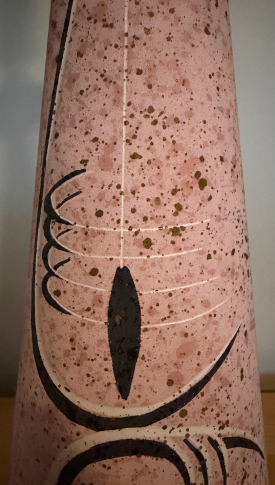 ITEM: For your consideration we are presenting for sale an amazing vintage pottery lamp manufactured by Tye of California. Circa '50s. Colors: Coral with gold paint splatter throughout. The atomic fish design appearing on the base is done in black and white. Materials: Ceramic. The lamp is signed with the date (1954) and Tye of Cali. etched into the base on the back side where the electrical cord emerges from the base (see photo). The lamp has a standard on/off rotary knob switch located at the socket. There is no shade present - just the base.MEASUREMENTS: The lamp stands approx. 27" tall x 5" wide x 5" deep. The distance from the bottom of the rounded base to the light socket is approx. 19.5" high. The pottery portion of the lamp is approx. 16.75" tall x 5" wide x 5" deep.CONDITION: The lamp is in very good, all-original condition. The ceramic is free from chips, cracks, breaks, scratches, repairs, etc. The colors are nice and uniform throughout. There is a small area on the bottom edge of the base towards the back where there is some greenish discoloration - we believe it came from the felt that is attached to the underside of the base. We have not attempted to clean it any manner, so it may or may not come out - we leave that up to the purchaser to handle. The electrical wiring looks to be original to the lamp, and it's in great shape - there are no frays, splits, exposed or brittle wires. The lamp is in fully-functioning, working condition. As with all vintage lighting, we always recommend having a licensed professional inspect before long-term use. Being sold "as-is", and "as-described". Please ask any questions that you may have prior to purchasing, and we will respond back to you in a timely manner.TERMS: Purchaser to pay s/h/i from zip code 62223 to your local zip code. Payment is due within two days of the listing ending. Have questions? Please ask them and we will respond back to you in a timely manner. All items are meticulously and carefully packaged to ensure a safe delivery. All sales are final - no refunds or returns, unless an item is grossly misrepresented. Thanks for looking, and please be sure to see our other listings that are presently on eBay. Thank you!