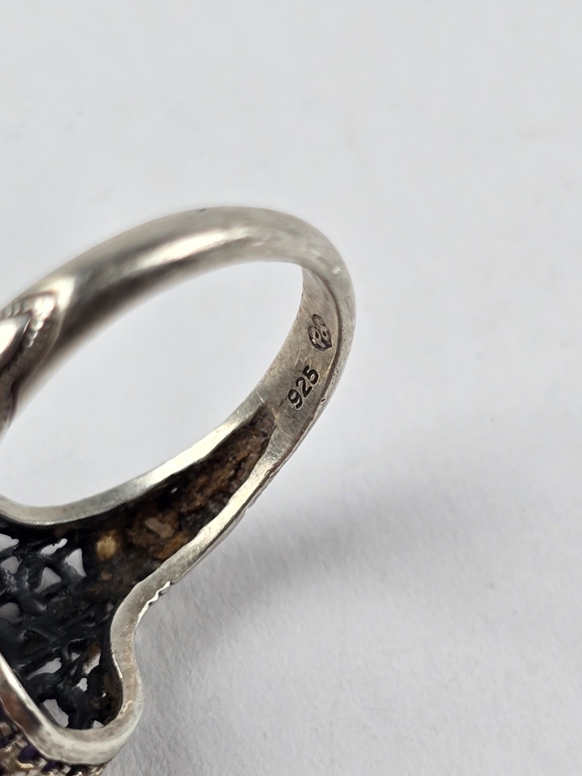 Vintage Sterling silver ring with filagree designLooks like an Art Deco era ring to meI on't usually see a frame underneath the stonesThe marking is the letter PD inside heartIn good condition overallCould use a polishSize 6Will be shipped with care inside a ring box