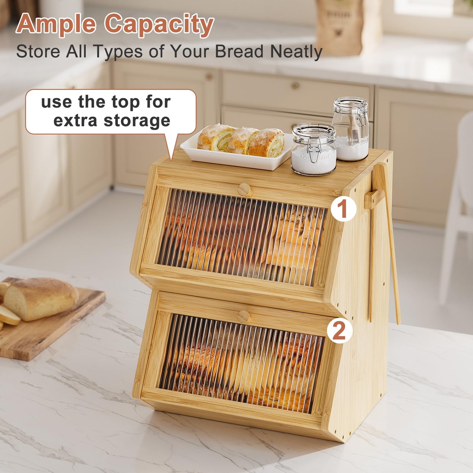 Bread Box for Kitchen Countertop Large Double Layers Bread Storage Container for Homemade Bread with WindowMaximize Countertop Space; Keep Kitchen Organized: Clear away clutter and create a neat, tidy kitchen with this large bamboo bread box. Perfect for organizing loaves, bagels, rolls, and pastries, it frees up valuable countertop space while keeping baked goods within easy reach for everyday family useDouble-Layer Large Capacity Bread Storage Bin: Featuring a unique two-tier trapezoid design, this double-layer bread box provides spacious storage for multiple loaves, muffins, or croissants. Each door opens separately, preventing flavors from mixing and keeping bread fresh, visible, and convenient to accessStylish Ripple Acrylic Door Panels for Modern Kitchens: The acrylic wavy panels combine elegance and practicality. Unlike plain glass, the ripple-textured design creates a hazy, decorative look while hiding clutter inside. This bamboo bread box doubles as a farmhouse kitchen décor piece and countertop bread organizerSturdy Bamboo Construction; Easy to Clean: Made from natural bamboo, this premium bread storage bin is sturdy, moisture-resistant, and safe for daily food storage. Its polished surface resists stains, grease, and odors, wipes clean easily, and ensures long-lasting performance as a bamboo bread keeperMultipurpose Countertop Organizer with Portable Handles: More than a bread container, this versatile bamboo bread box also stores fruits, snacks, coffee, or tea. Built-in bamboo side handles make it easy to move and reposition, making it ideal for apartments, homes, dorms, or farmhouse kitchen countertop use