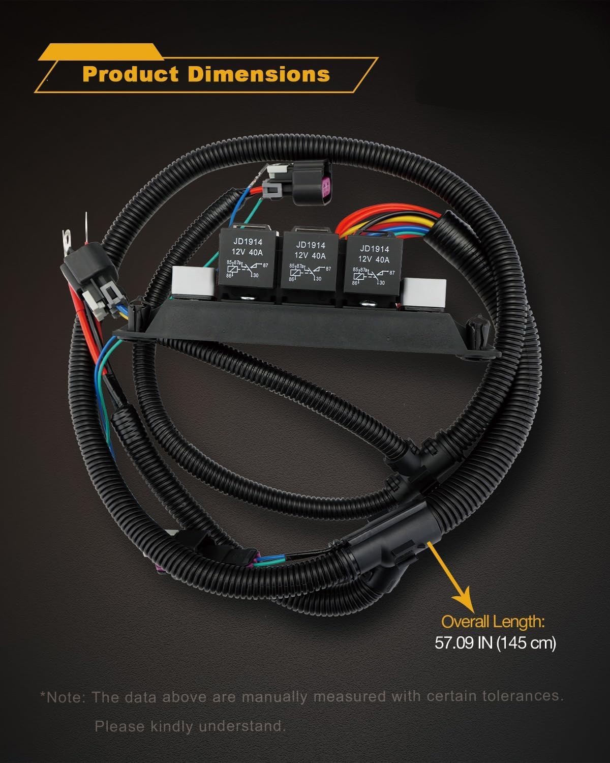 l【Upgrade Design】Our retrofit stand alone electric fan harness set contains circuit breaker and relay mounting, which is an independent fan harness, only for gasoline engines, only suitable for 34-inch wide radiators.l【Durable Matertial】The car electric dual fan control wire harness is made of high-quality plastic and copper wire. It has good contact, conductivity, and durability, ensuring reliable circuit transmission and operation. It offers resistance against friction, pressure, heat, oil resistance, and corrosion, with a long service life.l【Fit for】99-06 Chevy Silverado 1500 2500, 01-06 Chevy Silverado 3500, 07 Chevy Silverado 1500 2500 3500 classic style, 02-06 Cadillac Escalade/ Escalade ESV/ Escalade EXT, 02-06 Chevy Avalanche 1500 2500, 00-06 Chevy Suburban 1500 2500, 01-06 Chevy Tahoe, 00 Chevy Tahoe Silverado style; 99-06 GMC Sierra 1500 2500, 01-06 GMC Sierra 3500, 07 GMC Sierra 1500 2500 3500 classic style, 02-06 GMC Sierra Denali, 07 GMC Sierra Denali classic style, 01-06 GMC Yukon, 00-06 GMC Yukon XL 1500 2500, 00 GMC Yukon exc. denali.l【Easy Installation】Replace OE Number: 674-00923, 67400923. The dual electric fan controller is engineered to meet or exceed OEM