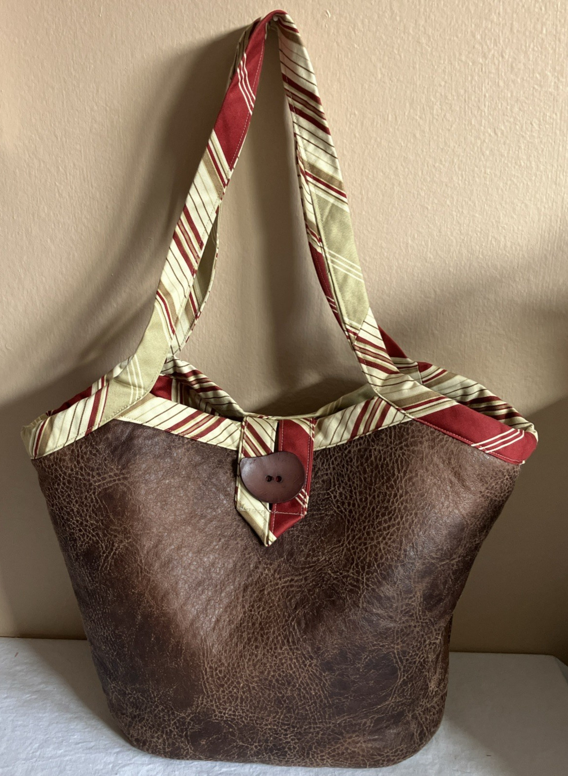 Handmade Fabric Sewing Tote Knitting Bag Purse Satchel Craft Bag Travel - Great Pre-Owned Condition Two inside slip pockets - button closure - faux leather and cotton fabric. Approximate measurements laying flat: Please see pictures Freshly laundered - ready to wear. Please review all pictures. Questions are welcome! Thank you! Reuse - Reduce!