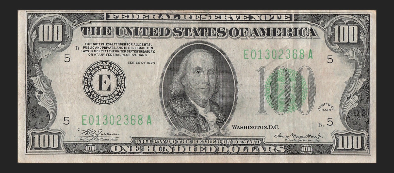 1934 Richmond One Hundred Dollar Bill E01302368A B2 Back Plate 89 Specs