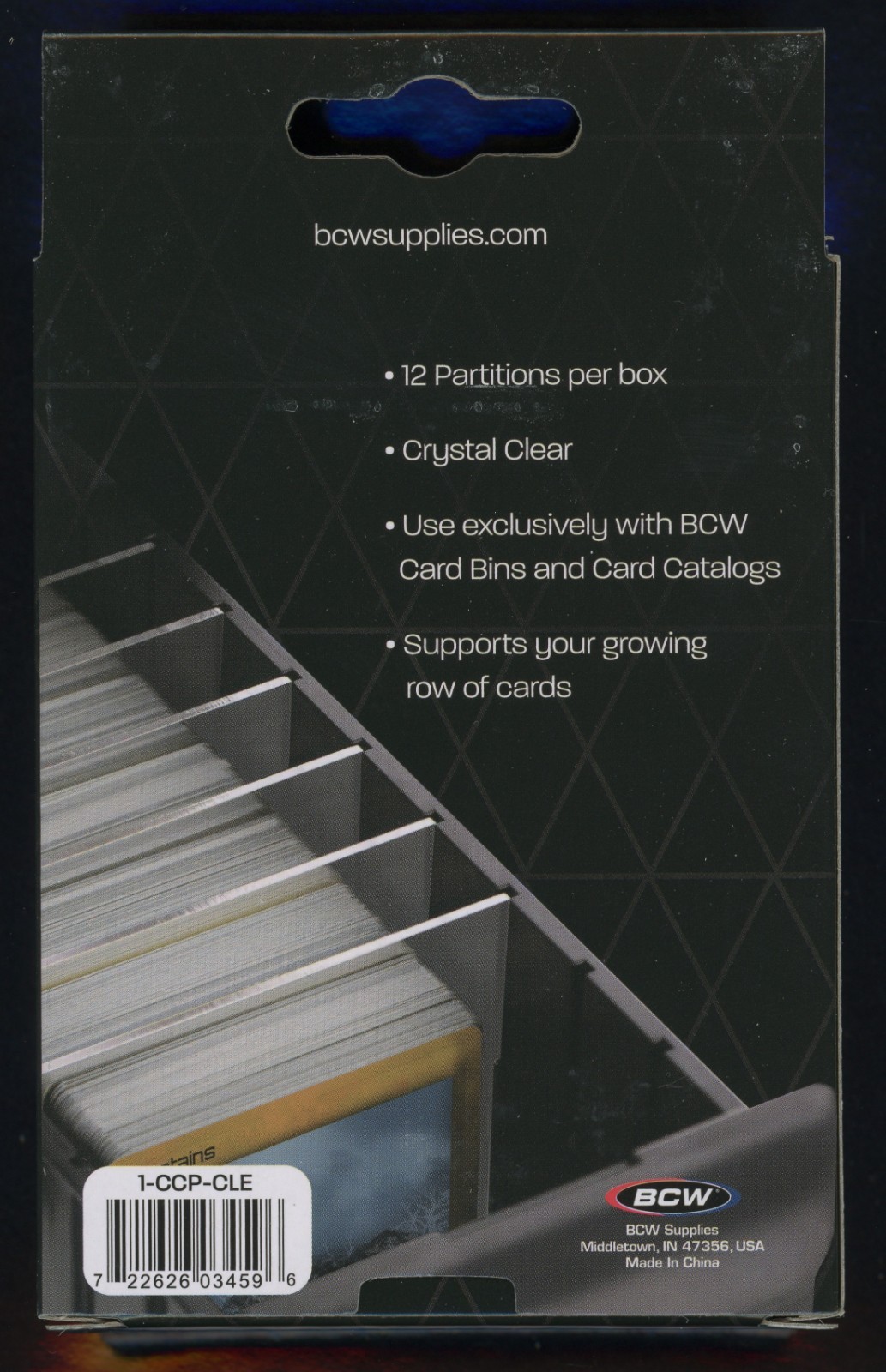 New and unused. Box of 12 BCW Card bin partition dividers (clear). The BCW Card Bin Partitions are designed to work exclusively with the 3200 & 1600 count card bins as well as the Card Catalog systems. They are notched and tabbed to hold into place while also providing some structural support for long stacks of cards. These additional dividers separate your box into visible sections. Adhesive labels can easily be affixed to the plastic.Crystal clear finishSupport your growing stacks of cardsUse with BCW's 3200 & 1600 series bins (Will not fit Graded Card bins)Also fits BCW Card Catalog systems