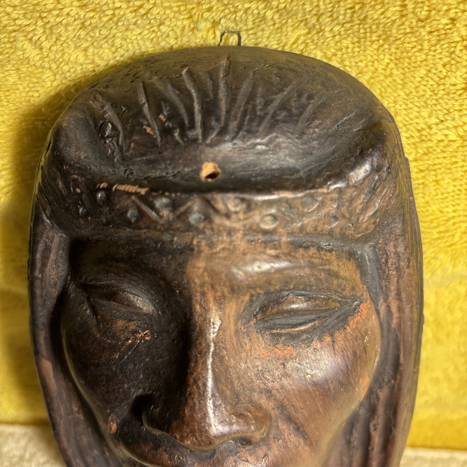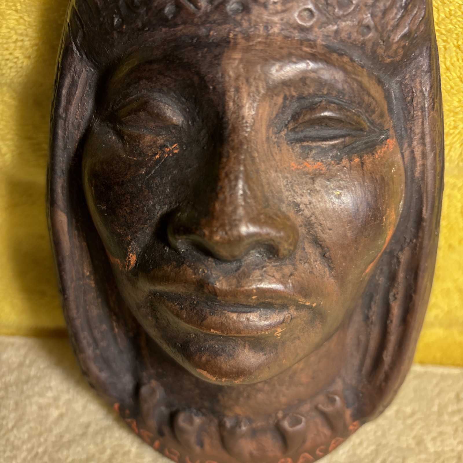 This vintage chalkware string holder wall decor features a Cacique Caracas tribe chief motif from Venezuela. It is listed in very good condition with no breakage seen, and it is described as an unusual collectible piece. Free shipping is included with the purchase. Check the listing for details on size, mounting method, and any signs of age-related wear or paint loss typical of vintage chalkware items.