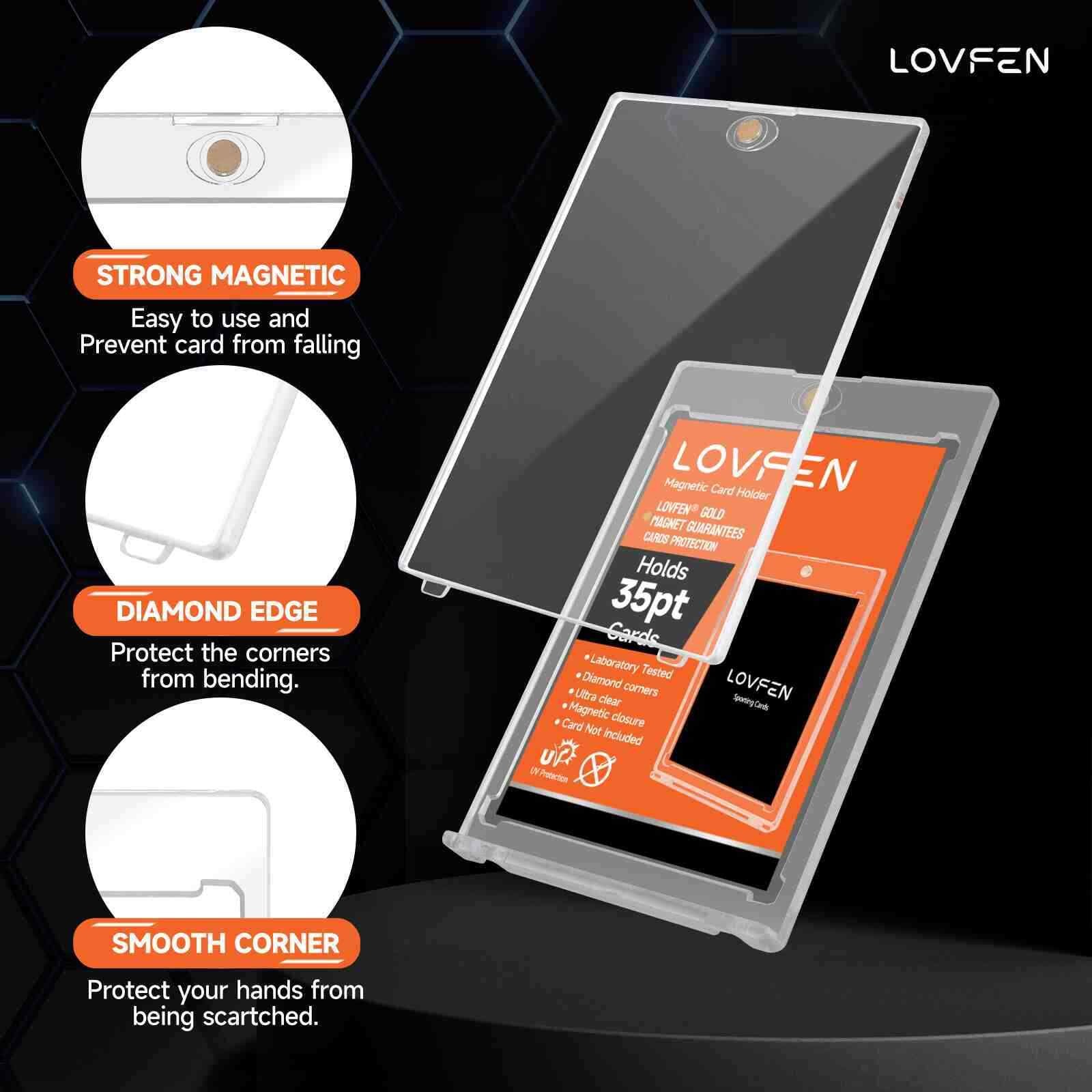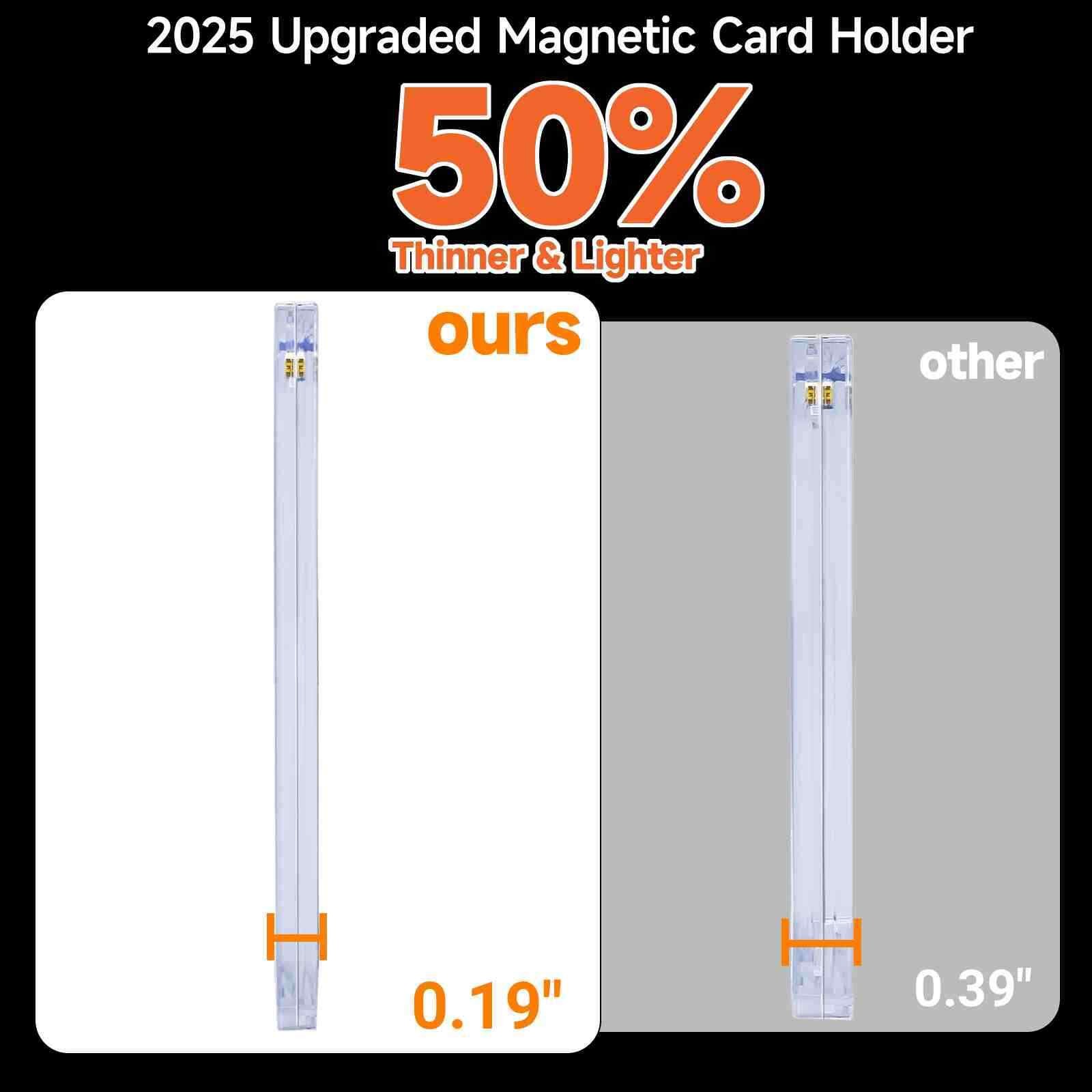 Protect,Store,Display your best-loved,unique,prized cardsSecure your collection with confidence. Shield them from dust, moisture, and wear. UV-Resistant: Our card protectors use UV-blocking additives to protect your precious cards from UV rays, no worries about your valuable cards being faded Diamond Corner Design: The diamond corners are designed to protect your favorite cards from any damage. Your cards will never be bent, scratched, or creased again. Wide Application: Magnetic card holder for trading cards to collect, store or display your favorite cards of all kinds, compatible with collecting trading cards, baseball cards, sports cards, game cards and more. Dimensions: 4.33" L x 2.87" W outside and 3.54" L x 2.52" W inside, sized to fit standard