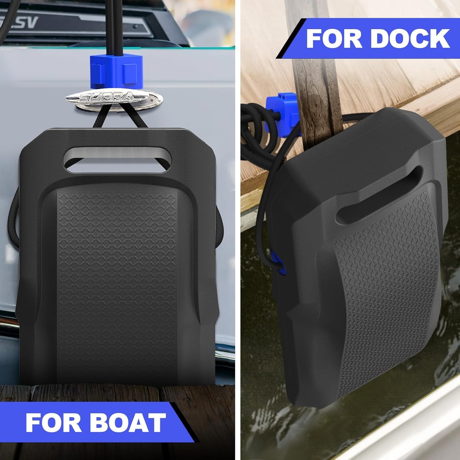 Boat fenders are made of high-performance EVA foam, designed for durability under intense UV and marine conditions. The back features multiple reinforcement ribs, providing ample support when compressed from the front. It absorbs and disperses collision forces with ease, delivering unparalleled cushioning for your boat. Hanging angle aligns of the suspension follows the contours of the hull, bumpers feature suspension points positioned lower than traditional boat bumpers. Ensuring that the boat fenders fit perfectly around the dock. This design helps prevent scuffing and damage around the boat, providing optimal protection for the boat. Our boat bumpers come with integrated auto-locking buckle and 1/3 in thick Heavy duty elastic cord, ensuring easy and reliable installation. No need for complicated knots; you can easily secure the boat fenders to boats, docks, pilings, and other locationsBoat fenders for docking measures: 16.93'' (length) * 8.78'' (width) * 4.33''(thickness). For optimal protection, we recommend using one boat fender for every 10 ft of boat length. For boats under 30 ft in length, we suggest deploying no fewer than three boat fenders. fenders will be a good fit for most types of boats, including bass boats, pontoon boats, fishing boats, jet ski boat, jon boats, PWC boats, and more. They ensure reliable protection throughout the docking, berthing, and mooring processes. Should you encounter any issues while using our products, please contact us promptly so we can promptly resolve them.