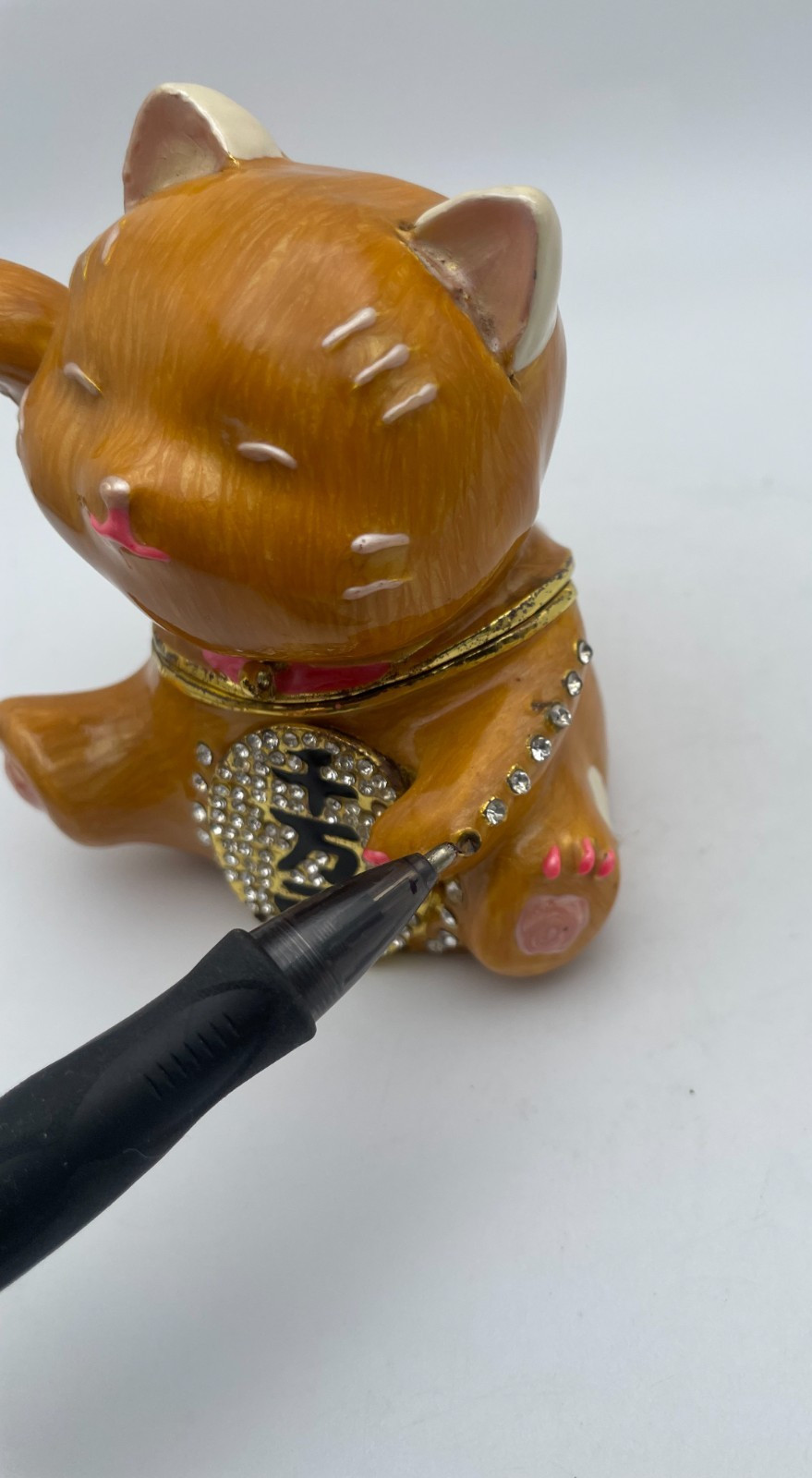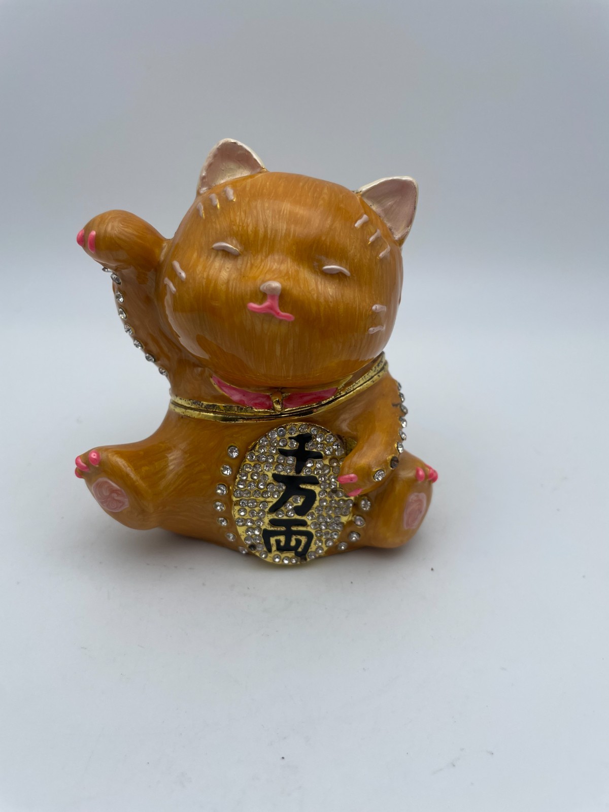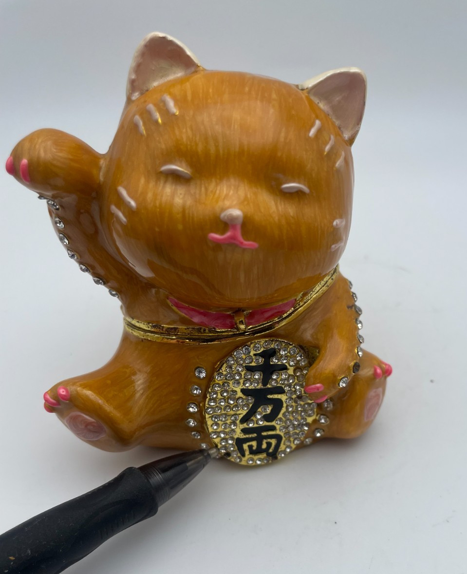 This Maneki Neko Lucky Cat trinket box jewelry box is a small collectible piece in good condition, as shown in the pictures. Please note it has two missing diamond stones; zoom in on the photos and read the listing description for full details. It comes from a non-smoking environment. Free shipping is included. If any features, materials, or measurements are not clearly stated, check the listing for details.