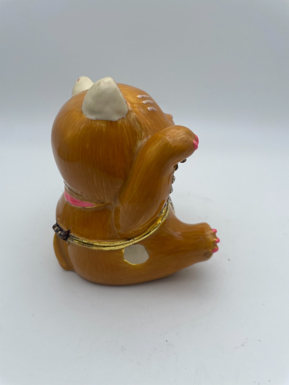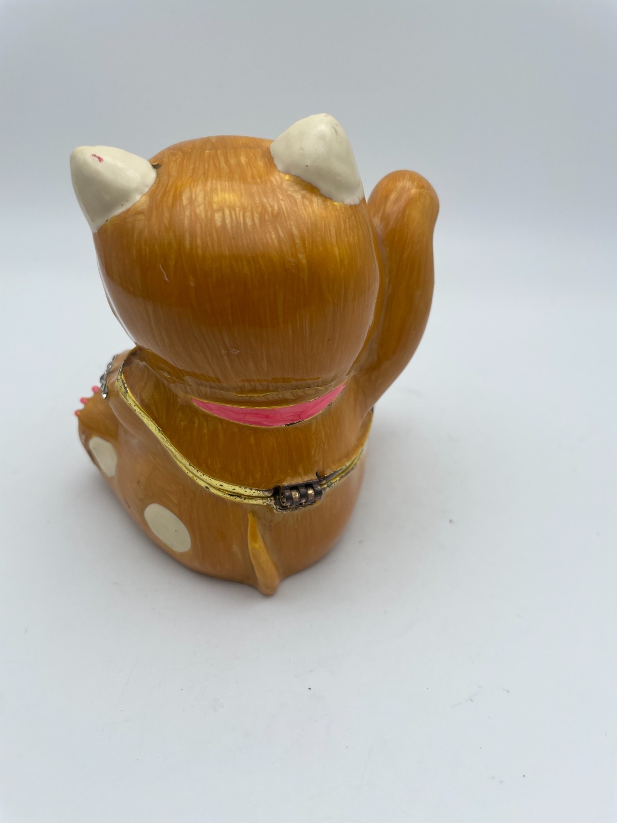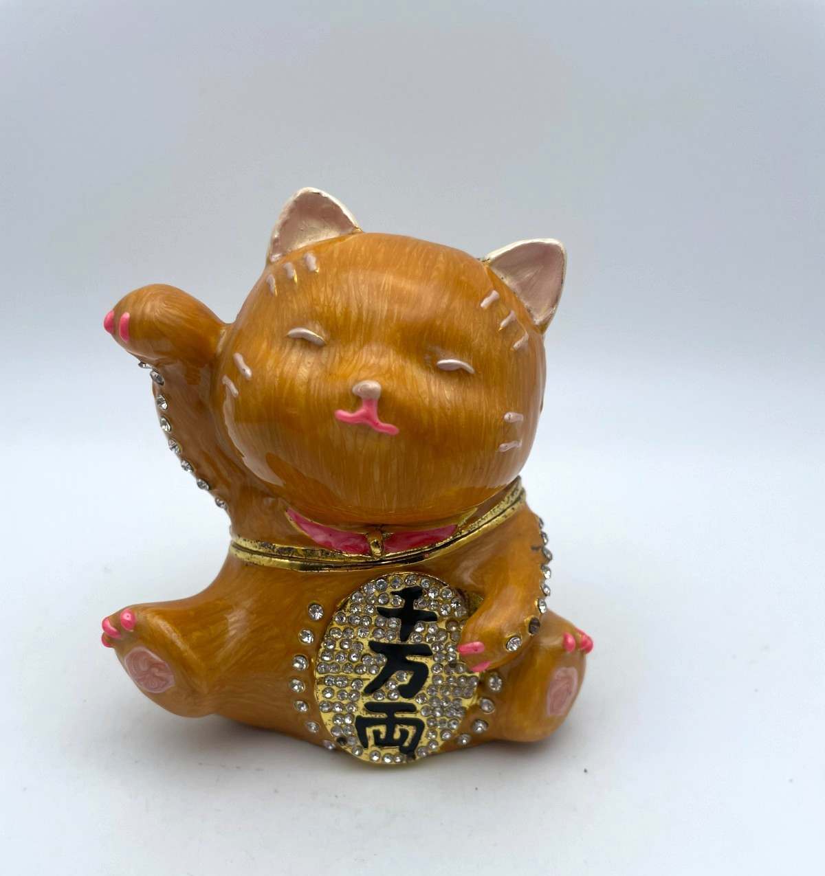 This Maneki Neko Lucky Cat trinket box jewelry box is a small collectible piece in good condition, as shown in the pictures. Please note it has two missing diamond stones; zoom in on the photos and read the listing description for full details. It comes from a non-smoking environment. Free shipping is included. If any features, materials, or measurements are not clearly stated, check the listing for details.