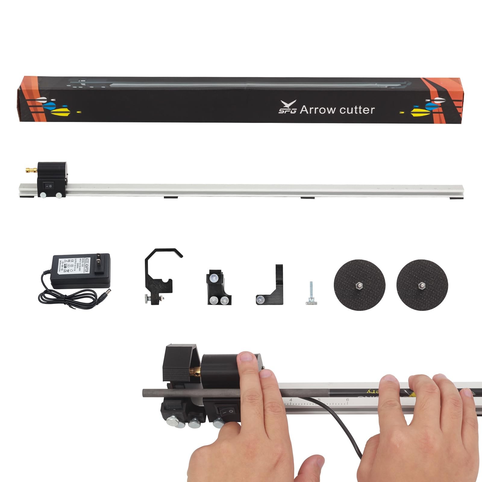 Product Details 【Powerful Dynamic System】SOPOGER electric arrow cutter is adopted a powerful motor, the no-load speed can be up to 12,000rpm.Cutting efficiency is higher and faster. After being skilled, you can even cut a dozen carbon arrows easily within 15 minutes. 【Lightweight & Portable Design】Arrow saw is lightweight, only 1.5lbs, with an overall length of 32inch. Our fully portable carbon arrow cutter is easy to operate. The thumb-actuated mechanism allows for quick cutting adjustments. It can be used with one hand, perfect for home and backyard arrow shaft cutting projects. 【Versatile & Precise Cutting】This durable arrow cutter is equipped with an upgraded plug for 100-240V, providing high power for the toughest cuts. Suitable for serious professional shooters or DIY enthusiasts to cut carbon arrows, fiberglass arrows, aluminium arrows and more. Arrow shaft cutting range is 4.3-32inch (11-81cm). Satisfies the DIY cutting needs of most archery hunting enthusiasts. 【Safe & Efficient Saw Blade】With dust cover and double-layer fiber mesh resin saw blade effectively reduces the probability of breathing in dust. The attached heavy-duty and rigid saw blades (2pcs) cut the cross section without visible saw marks and burrs, minimising the risk of structural damage to the arrows. 【Strong & Compact Structure】The overall 3D printed structure of SOPOGER arrow squaring tool makes the components lighter and stronger, which can effectively absorb the impact. Widely used high-strength CNC aluminum alloy base plate is sturdy and durable. The adjustable slider at the end of the brace can support carbon arrow shaft firmly and stably. Let you thoroughly entertain the charm of cutting and building arrows. 【Sustainability at SOPOGER】SOPOGER is a professional archery manufacturer, focusing on product quality. Please feel free to contact us with any questions during your daily use, we are always there. SOPOGER Carbon Arrow / Bolt Saw: Perfect Stocking Stuffer, Christmas Gift for Dad, Mom, Friends, DIYer, Archers, Shooters