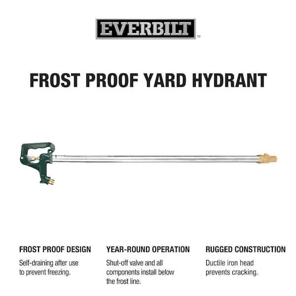 2 ft. Bury Depth Frost-Proof Yard HydrantThe frost proof Everbilt yard hydrant has a shut-off valve which operates below the frost line to supply running water, for reliable irrigation even in the coldest weather. The water hydrant can easily be repaired without digging. This yard hydrant has a strong 1 in. galvanized steel stand-pipe and a 3/4 in. female NPT brass valve to connect to the water supply pipe.Self-draining when handle is in closed position to prevent freezingHeavy duty cast iron head with bucket hookExtra-large cast iron handle for easy operationBrass clevis rod and hose connectorDouble o-ring sealing system provides a positive seal1-piece plunger design provides a positive seal and easy adjustmentPlunger is easily adjustable with square head set screwBury depth of 24 in., meaning 27 in. will be above groundYard hydrant complies with federal lead laws