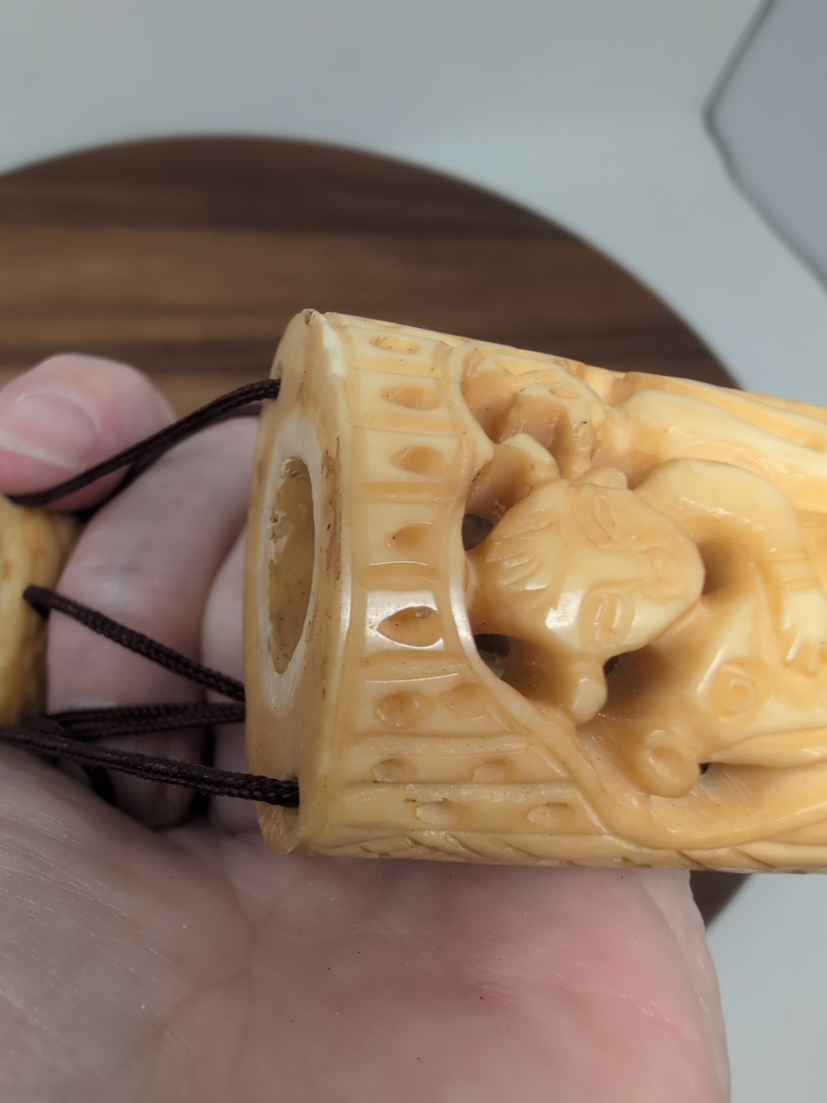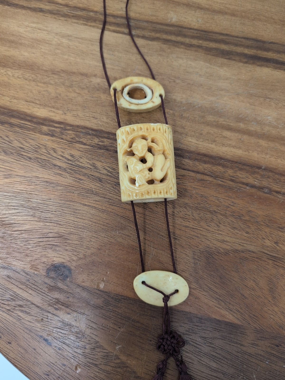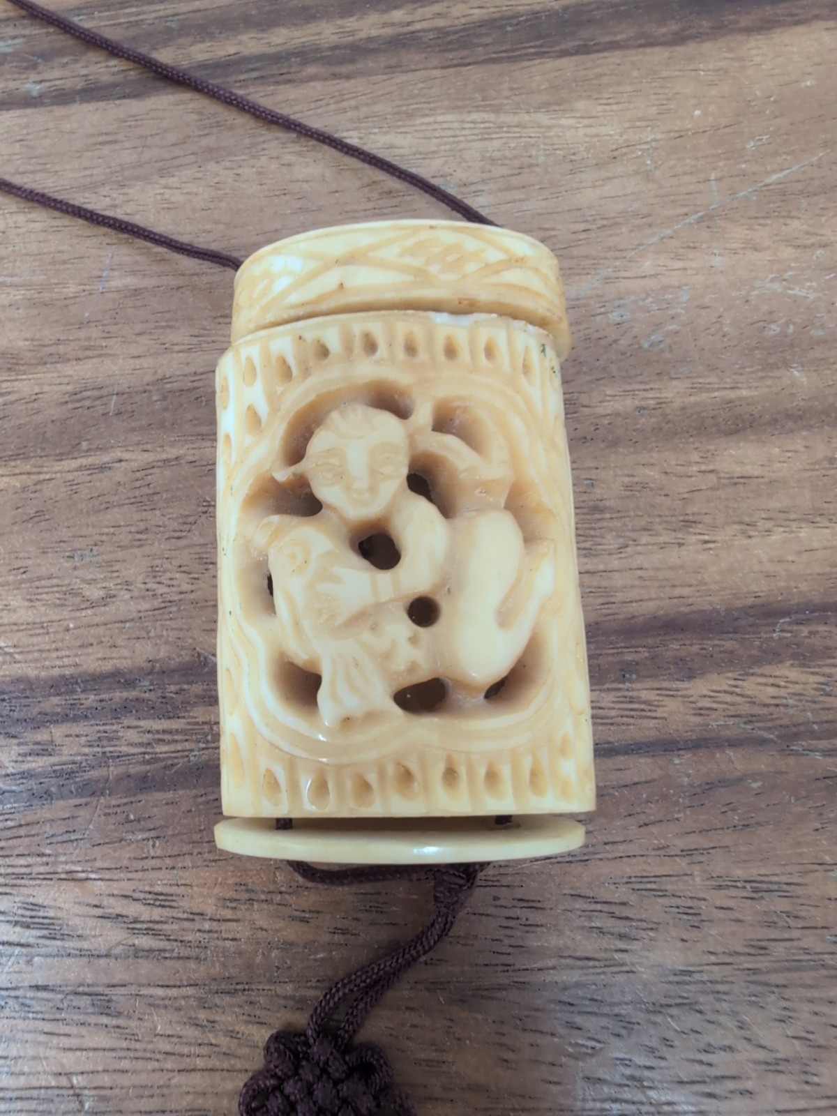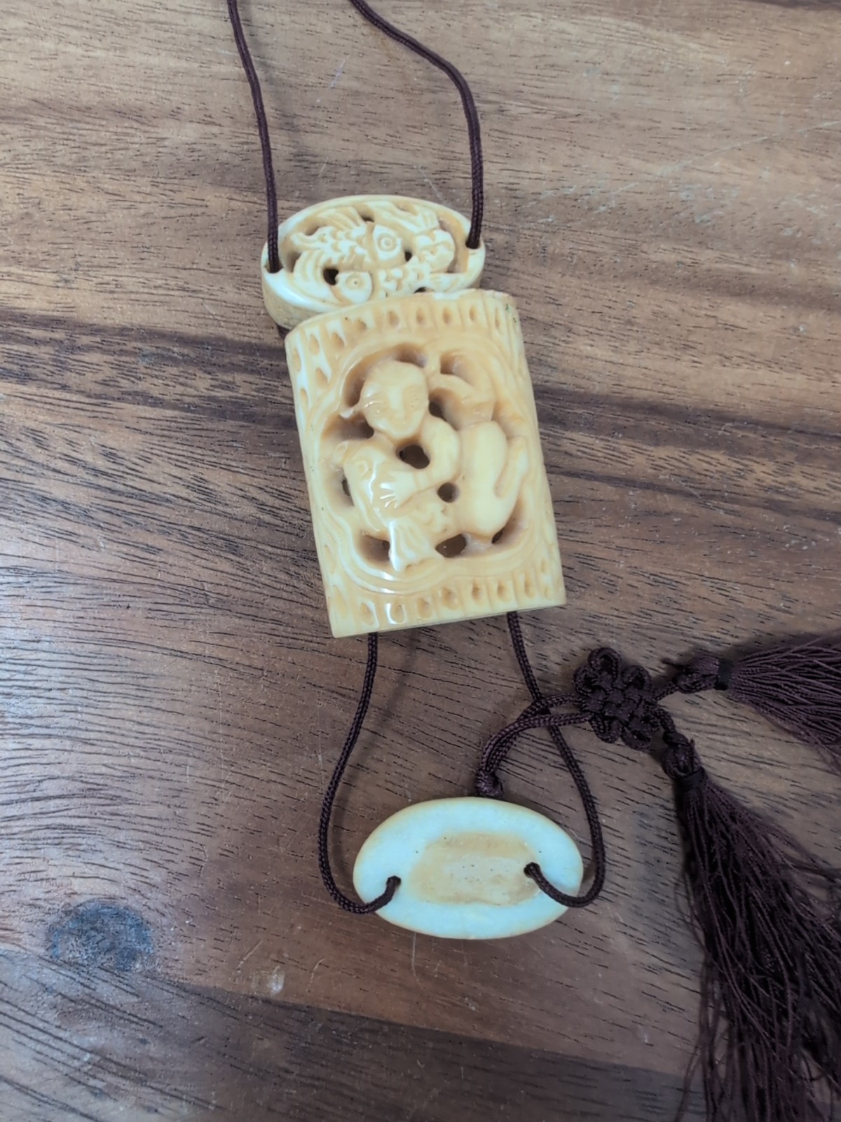 Thank you for your time. Please look at all the pictures. They are part of the description. On the front there seems to be a little chip under the first part of the cricut cage. I believe it is a cricket carrier from China. It opens on both ends. Please look at the pictures for measurements. It is quite a unique carving. I actually picked this up in New Mexico. I recently went out of town and decided to do some treasure hunting. It is a beautiful piece. It seems to have more age than just vintage. It has a carving of creature riding a fish and then two fish up top. And there's three parts to it. It is all on the necklace and each part separates. Please see pictures.