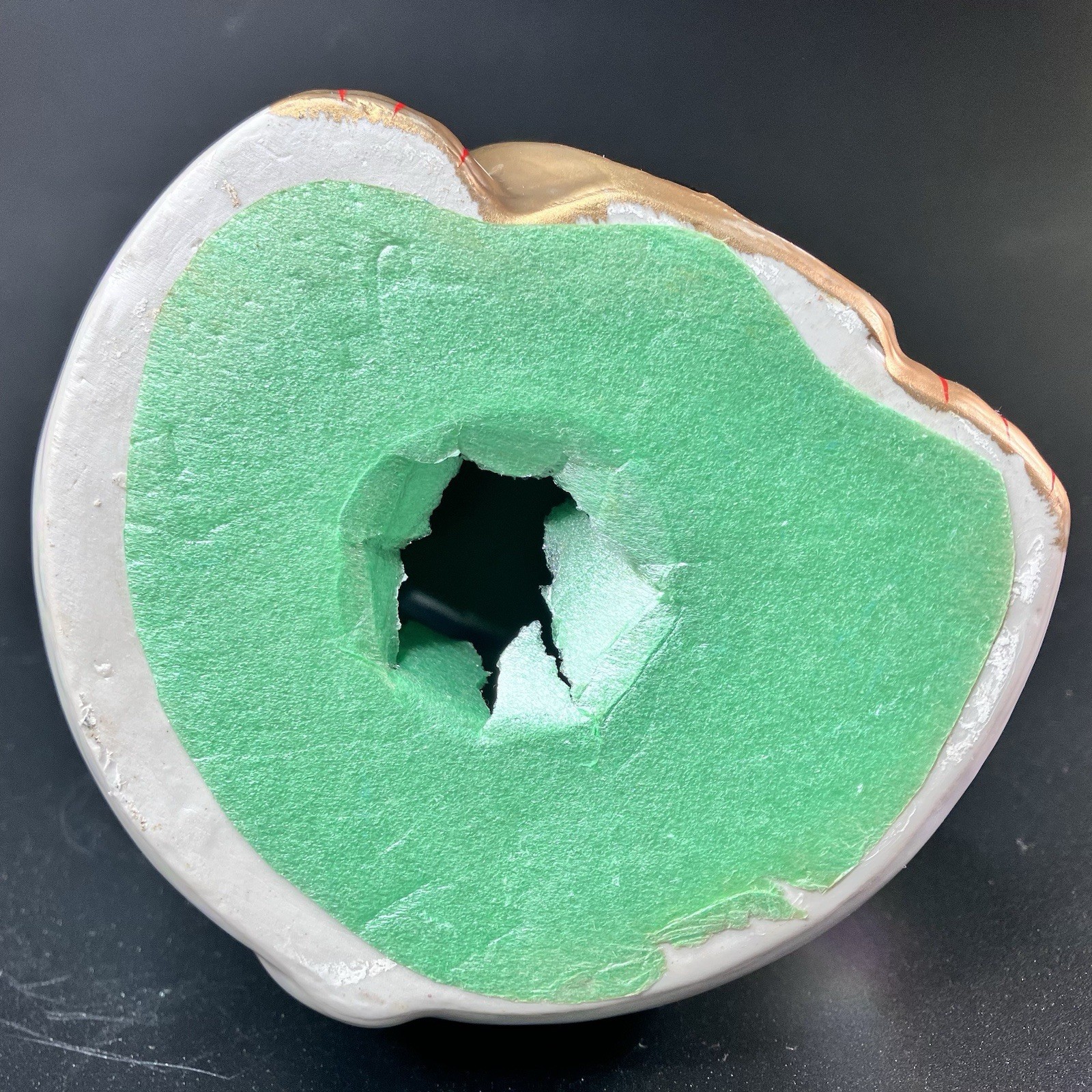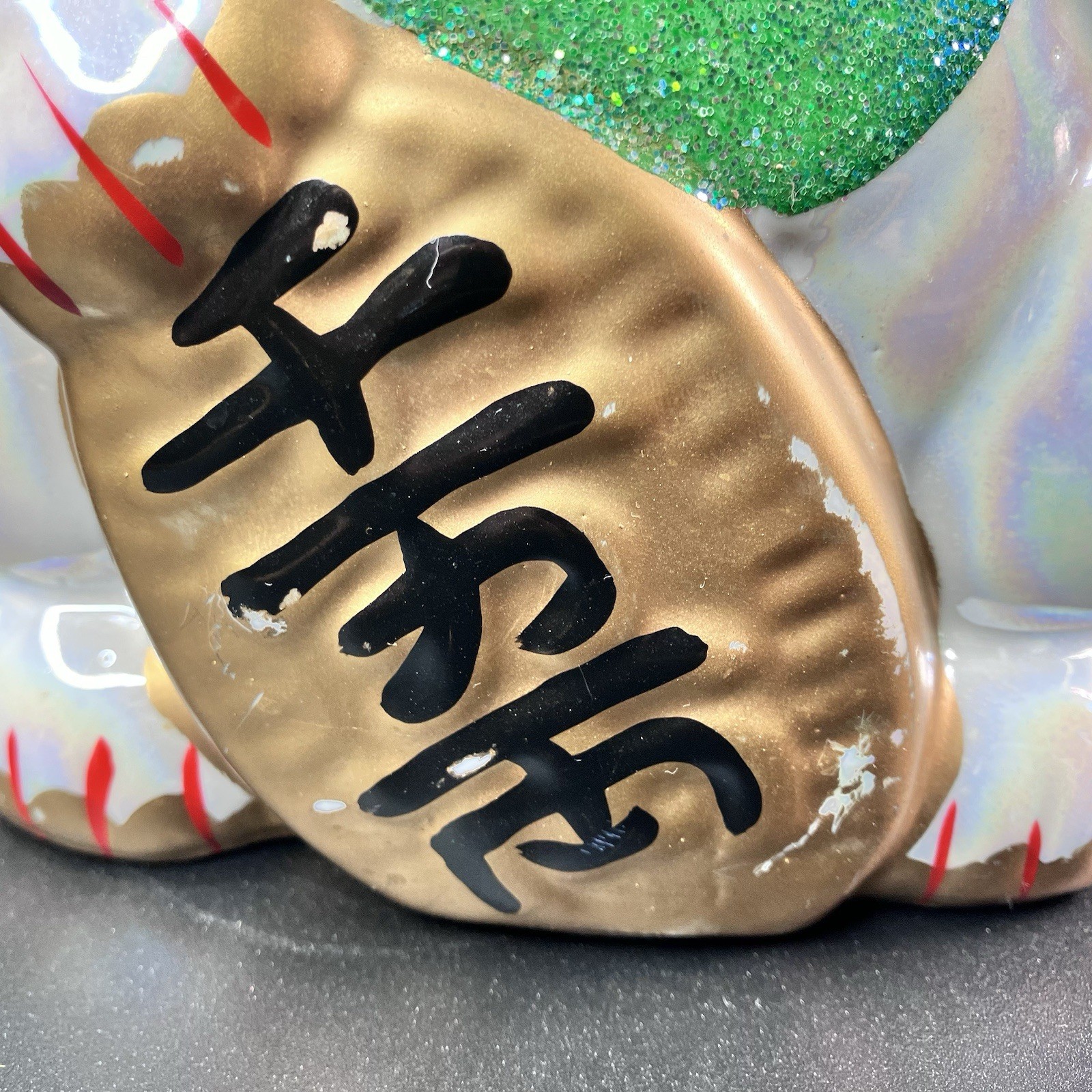This vintage Maneki Neko beckoning cat coin bank from Japan measures about 8 inches tall by 5 inches wide and features a pearl, iridescent-like finish with the left hand raised. It is in clean, preowned condition, with some irregularities in the paint detail, including scuffs (notably in the gold paint) and marks that may be from manufacturing. The green cover on the bottom has been punctured. Review the listing photos for full condition details. Free shipping is included.