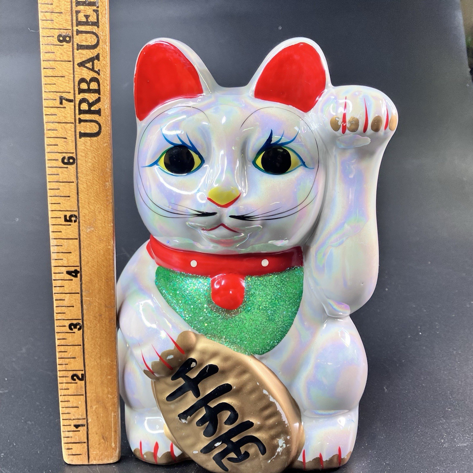 A vintage maneki neko beckoning cat coin bank. 8 inches tall by 5 inches wide. Pearl, iridescent-like coloring with left hand raised. Item is in clean, preowned condition. Shows a few irregularities in the paint detail, including some scuffs, especially in the gold paint, and others that appear to be part of manufacturing. Green cover on bottom has been punctured. Please see photos for complete description.Vintage Maneki Neko Beckoning Cat Coin Bank - 8" Iridescent FinishA charming and collectible Japanese lucky cat to bring prosperity to your home or collection!Item Type: Maneki Neko (Beckoning Cat) Coin Bank.Dimensions: Approximately 8 inches tall by 5 inches wide.Hand Position: Left paw raised, traditionally beckoning customers or good fortune.Color/Finish: Pearl or iridescent-like white coloring with painted gold, red, and black details.Condition: Pre-owned and in clean vintage condition.Paint Detail: Shows characteristic irregularities in the paint application, including some scuffs, particularly noticeable on the gold-painted accents. Some minor imperfections appear to be part of the original manufacturing process.Base: The original green felt or plastic cover on the bottom has been punctured (see photos).No chips, cracks, or major damage to the ceramic body.Collectibility: A wonderful addition to any vintage toy, bank, or Japanese culture collection.See Photos: Please refer to the provided photographs for a complete visual description of the bank's condition, paint detail, and the bottom cover. Photos are considered part of the description.Keywords: Vintage, Maneki Neko, Beckoning Cat, Coin Bank, Piggy Bank, Lucky Cat, Japanese Decor, Iridescent, Pearl Finish, Pre-owned, Collectible.