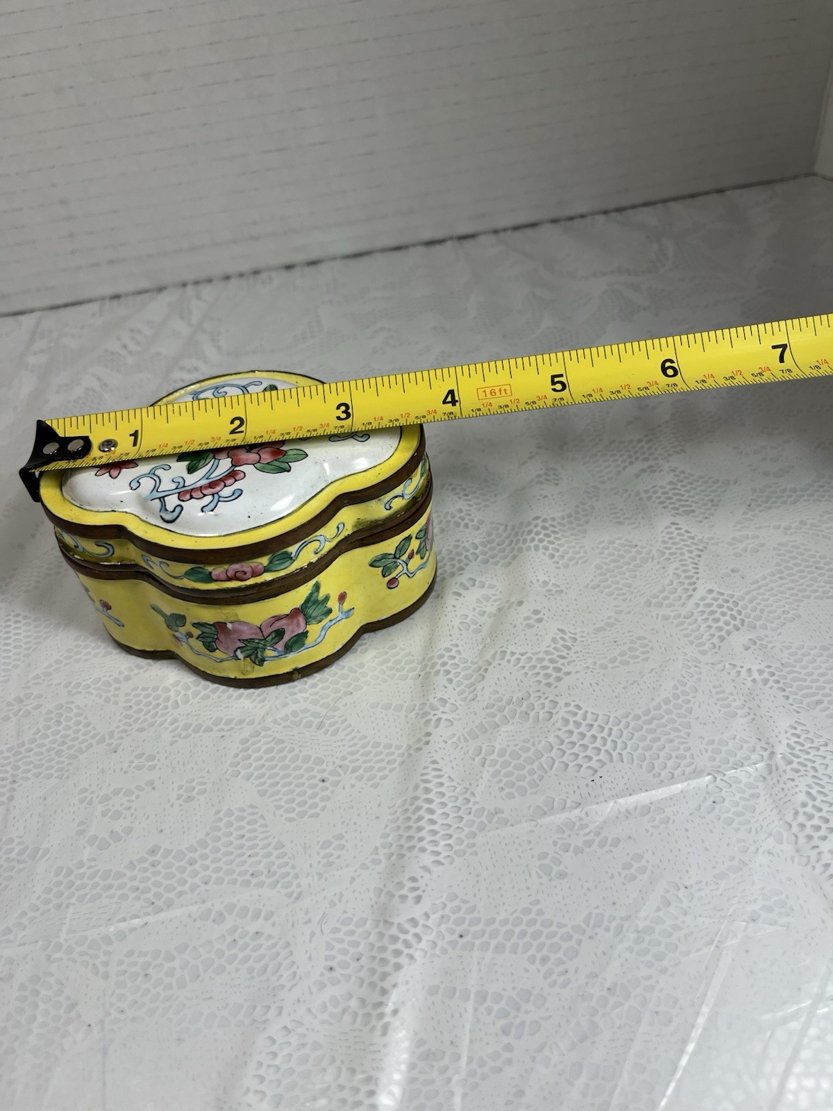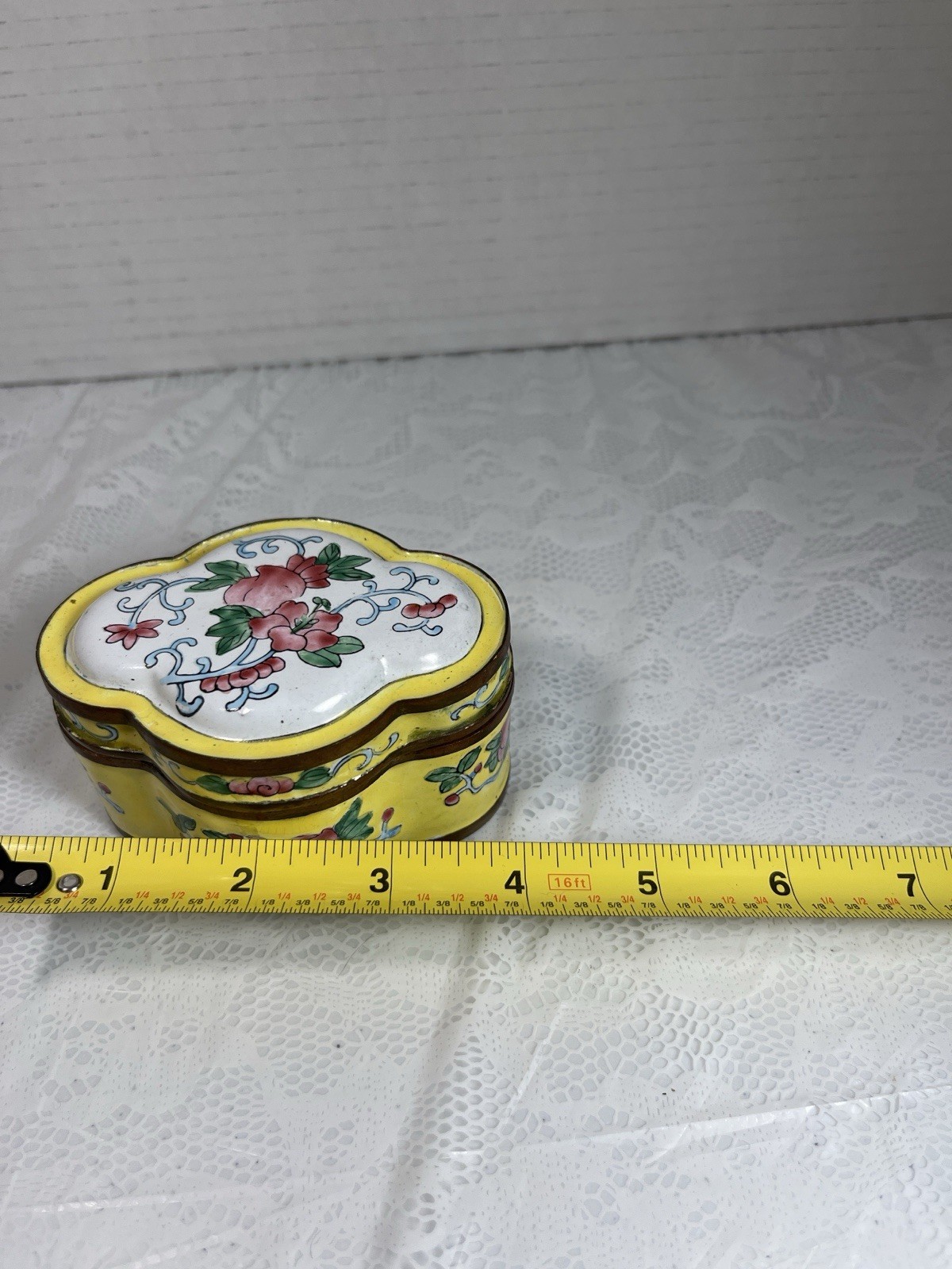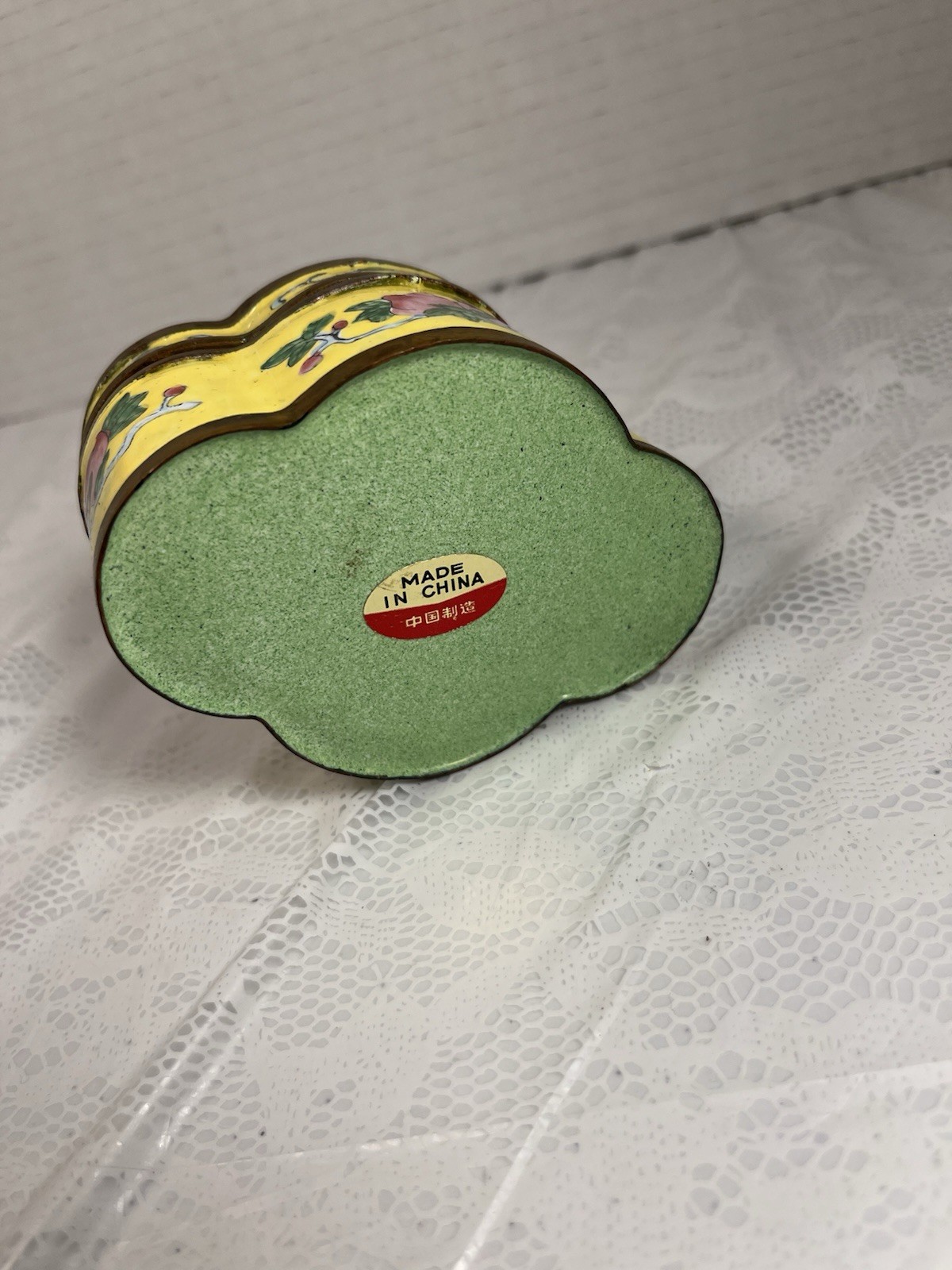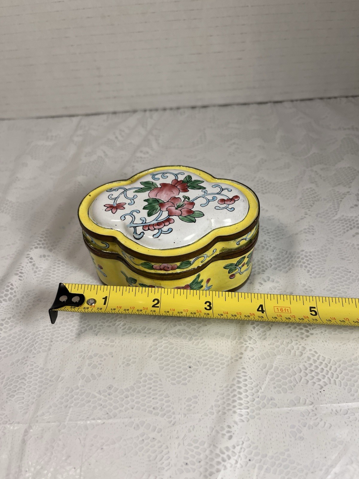 Hand-painted Chinese export porcelain trinket box featuring a bright yellow ground with floral and scrolling vine motifs. The box has a classic lobed (clover-style) shape with a fitted lid and decorative hand-enamel detailing throughout. Finished with a felted base and original “Made in China” label on the underside.This decorative keepsake box is ideal for storing rings, earrings, pills, or small personal items, and also works well as a display accent on a dresser, vanity, or shelf.Approximate Measurements: • Length: 4 inches • Width: 3 inches • Height: 2¾ inchCondition:Very good vintage condition. No chips or cracks noted. Light surface wear consistent with age and gentle use. Colors remain vibrant. Please review all photos for exact condition and details.Additional Details: • Material: Porcelain • Origin: Chinese export • Era: Late 20th century • Shape: Lobed / clover • Base: Felted bottomA charming decorative piece that combines traditional Chinese styling with practical everyday use.