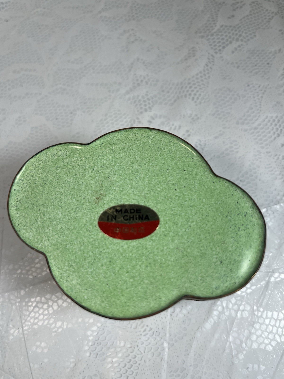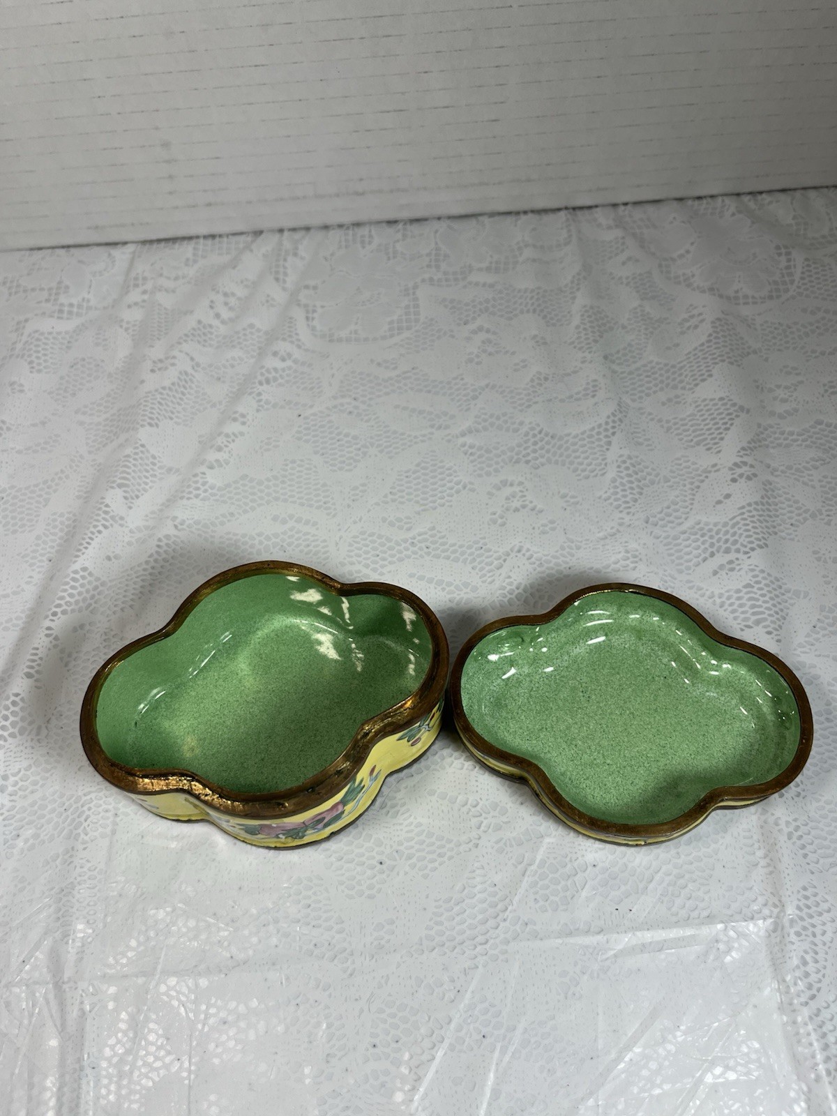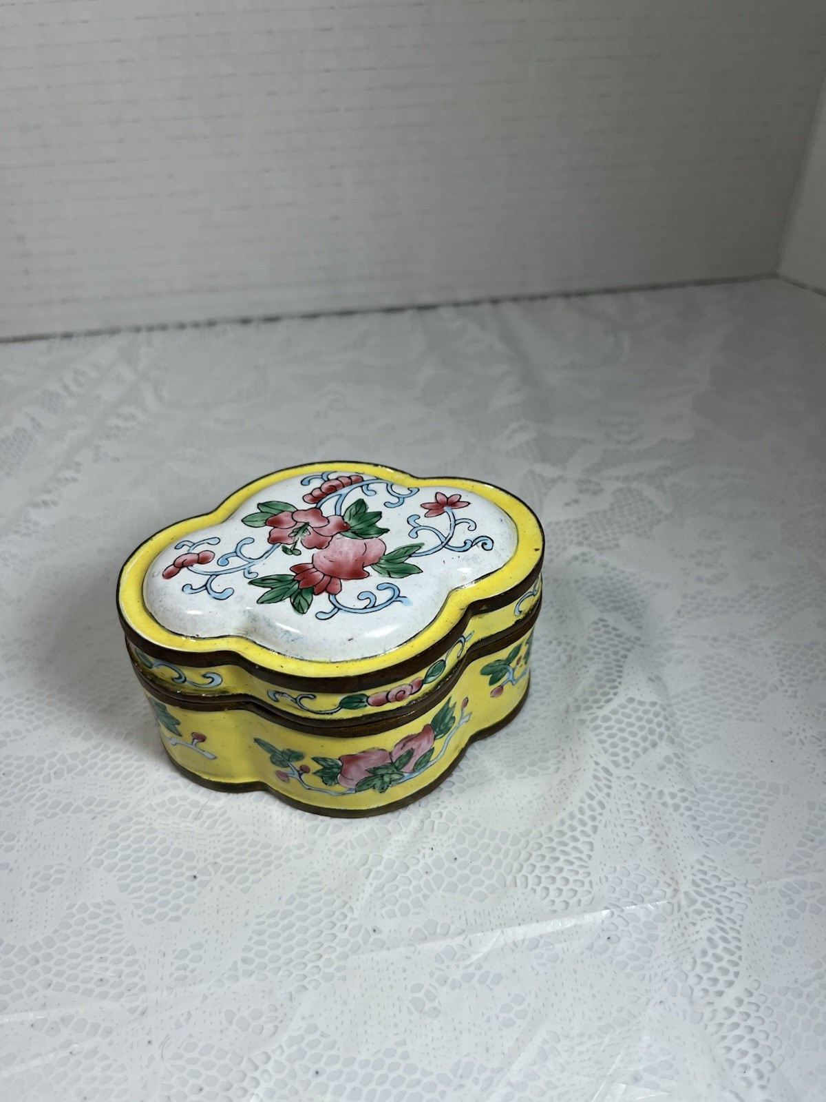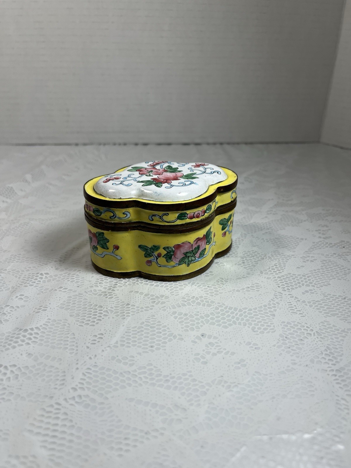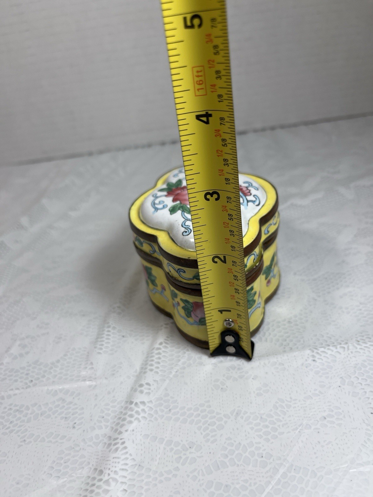 Hand-painted Chinese export porcelain trinket box featuring a bright yellow ground with floral and scrolling vine motifs. The box has a classic lobed (clover-style) shape with a fitted lid and decorative hand-enamel detailing throughout. Finished with a felted base and original “Made in China” label on the underside.This decorative keepsake box is ideal for storing rings, earrings, pills, or small personal items, and also works well as a display accent on a dresser, vanity, or shelf.Approximate Measurements: • Length: 4 inches • Width: 3 inches • Height: 2¾ inchCondition:Very good vintage condition. No chips or cracks noted. Light surface wear consistent with age and gentle use. Colors remain vibrant. Please review all photos for exact condition and details.Additional Details: • Material: Porcelain • Origin: Chinese export • Era: Late 20th century • Shape: Lobed / clover • Base: Felted bottomA charming decorative piece that combines traditional Chinese styling with practical everyday use.