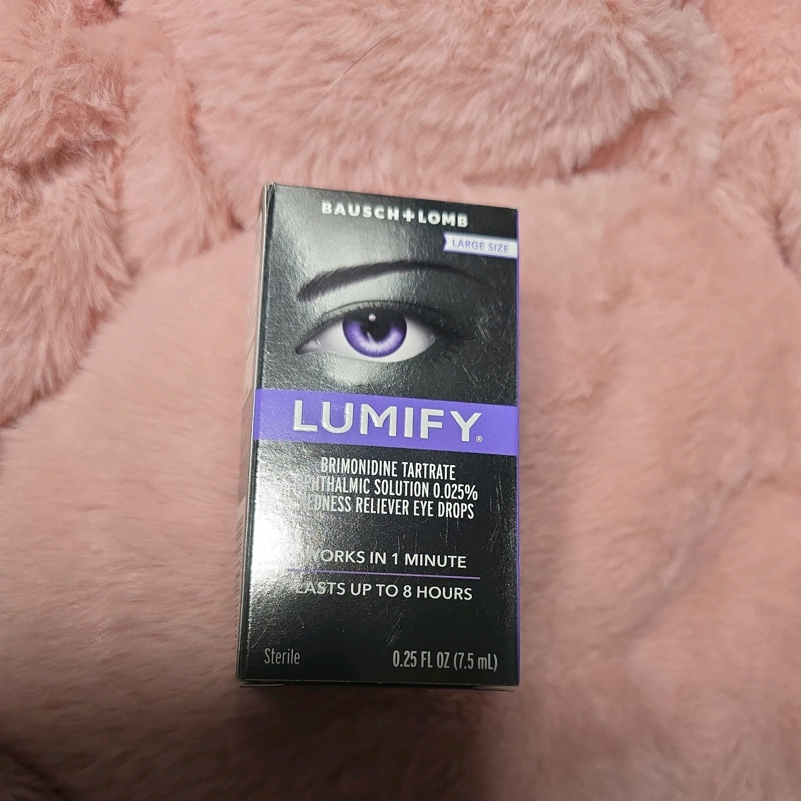 this lot comes with a free gift! with this order you will receive one box of 25 sterile single use vials of blink tears dry eye lubricating eye drops for mild to moderate itching or dry eye.This is likely a product I will have often, as it is something I coupon regularly. I have been using this eye drop line for over a year now and have seen a large improvement in the fullness of my eyelashes and eyebrows.The product is a lot of 3 Bausch + Lomb Lumify Eye Drops, with a total volume of 12.5ml (0.25 fl oz). Each eye drop contains 3mg of the active ingredient and is designed for eye health, providing relief for dryness and redness. The drops have an expiration date of 2/2027 and 6/2027 and are made in the United States. The Lumify product line is known for its effectiveness in eyelash and eyebrow growth and lengthening, and addressing eye-related issues, making it a reliable choice for maintaining eye health and comfort.