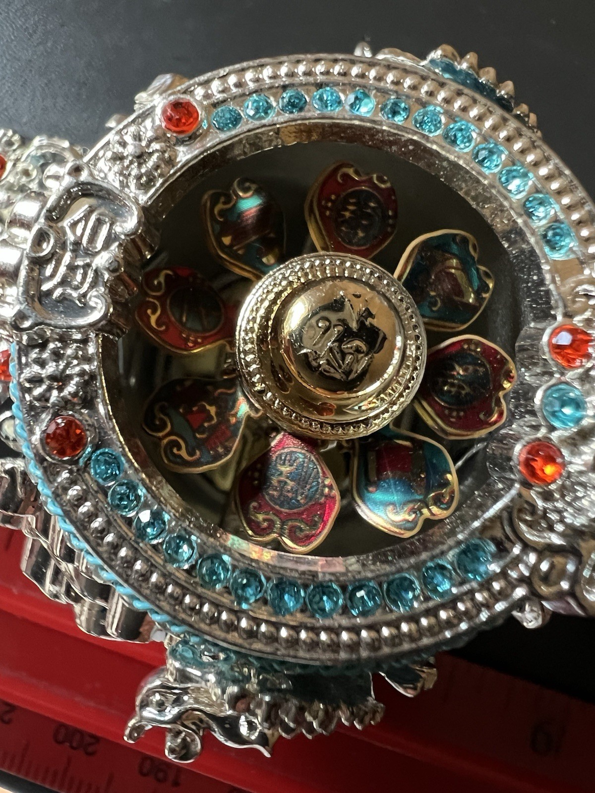 This Buddhist Prayer Wheel in blue with glass is a used collectible piece suitable for display or collection. Specific materials, dimensions, origin, and any included accessories are not provided, so check the listing for details. The item is offered in used condition; review photos and the listing notes for cosmetic wear or signs of prior use. Free Shipping is included with the purchase. Price is listed at $75.00 USD. If you need confirmation on markings, size, or functionality, check the listing for details or contact the seller before ordering.