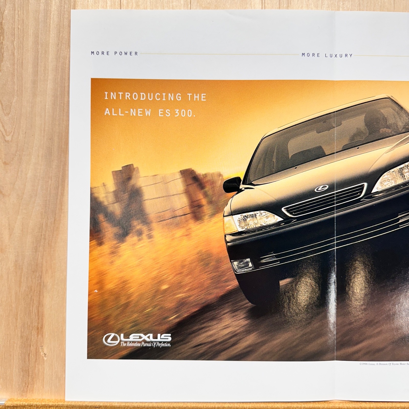 size format and categories (Add 3 to cart)2 connected pages Approximately 16 in. X 11in. G FC older in the middle. Original advertisement saved from actual magazines, they have been trimmed to clean up edges. They arrive ready to be put in a frame or however you wish to display. Shipped well protected in bag and board with corrugated sheets padding and waterproof poly mailer bag. Shop multiple items from our store and enjoy great savings.Additional print ads ship together with no additional shipping charge when you use the add to cart function for check out. The product is a vintage print ad featuring a 1996 Lexus ES 300 black sedan. The ad is a two-page print advertisement in multi-color, showcasing the sleek design and features of the Lexus ES 300 model. This original ad from 1996 is a collectible piece of automobile advertising art, originating from the United States but with a theme focused on automobiles, specifically Asian-made vehicles like the Lexus ES 300.