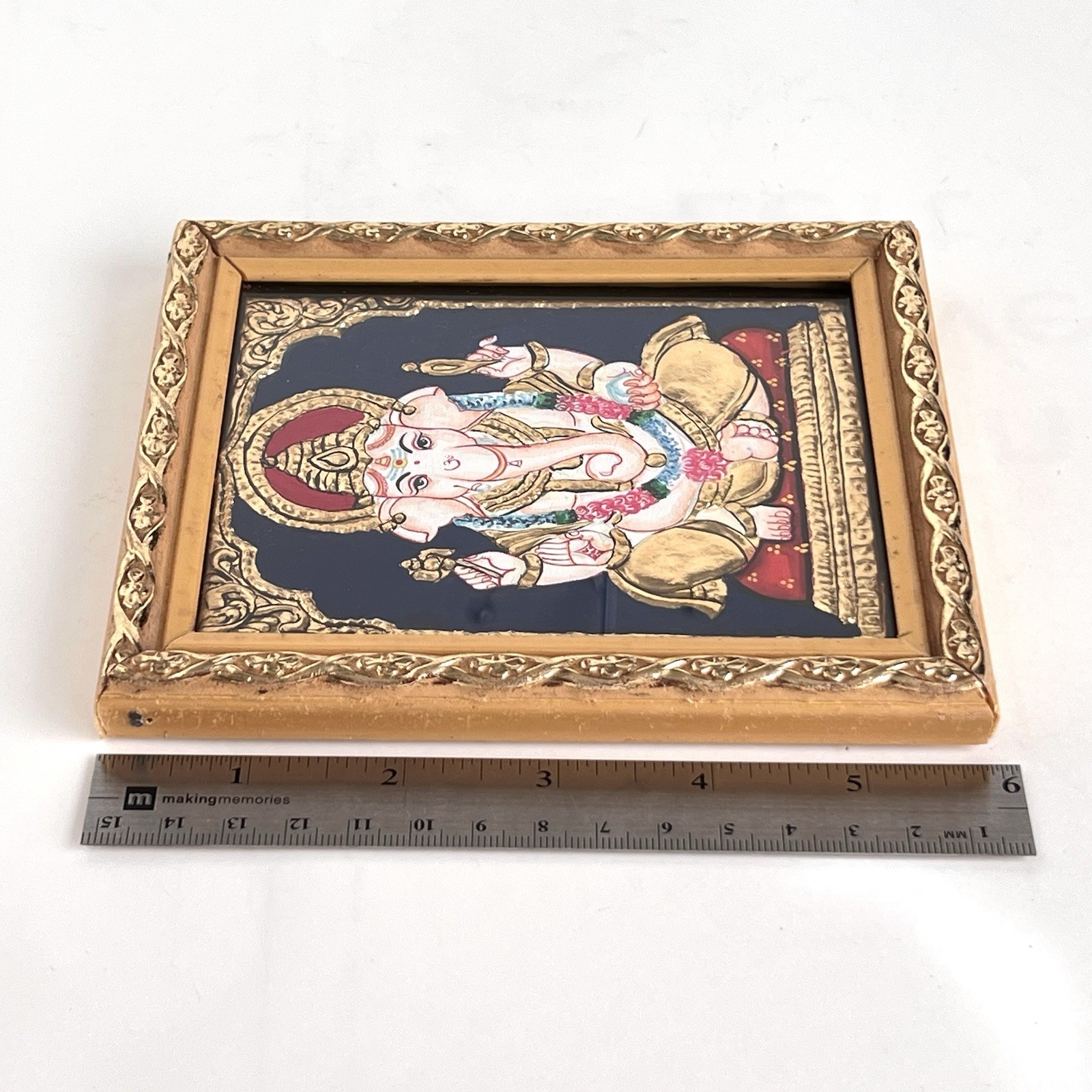 The product is a vintage print of Ganesha, an Indian Hindu God, in a small gold frame. The 5x6 inch print is from India and is a collectible item related to Hinduism. This decorative piece would be a unique addition to any religious or spiritual collection, showcasing traditional Indian artwork and symbolism.Easel not includedSee photos for condition We use USPS and FedEx to ship.We use mostly recycled boxes to reduce waste at our landfills.