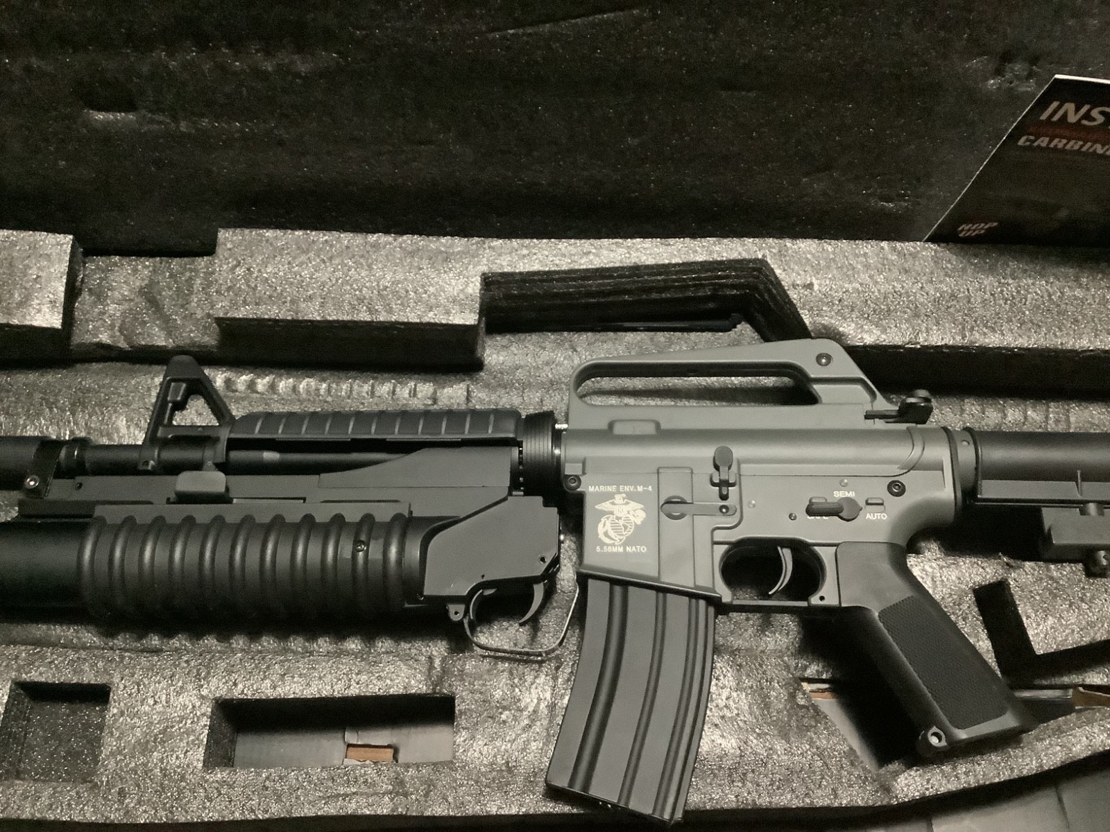 E&C XM177e2 AEG with Long Barrel M203 Airsoft gun New in BoxPackage includes gun,instruction manual,magazine and boxBody of Airsoft gun,launcher and barrel are full metal and requires LiPO battery not included