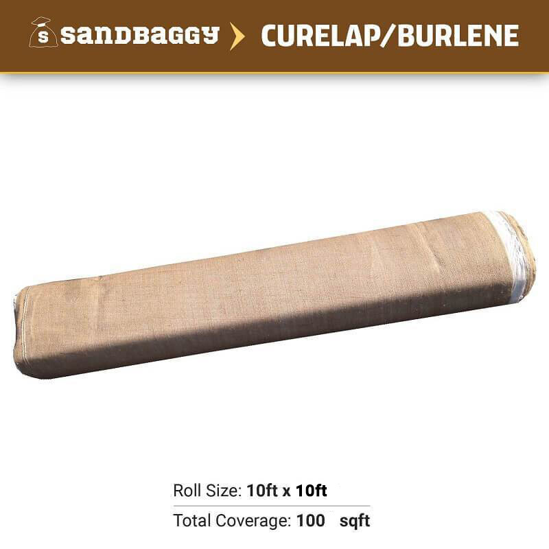 Sandbaggy Concrete Curing Blanket - Also called Curelap or BurleneCOMPACT 10 FT X 10 FT ROLL - Made with 10 oz burlap and 5 mil poly fabric laminated together, burlene is the most economical solution for curing concrete. The burlap distributes water evenly over fresh concrete, the poly fabric helps reflect sun rays. Our burlene blankets are uniquely UV treated to increase the overall life of the roll.MAKES CONCRETE STRONGER & PREVENTS CRACKS - The unique blend of burlap and plastic laminated together allows the concrete to stay wet longer, allowing the concrete to be stronger and helps decrease the chance of cracks forming. To achieve optimal concrete strength, re-wet the burlap daily or every other day. MEETS DOT & AASHTO SPECS - Our blanket meets or exceeds DOT requirements and AASHTO M-182