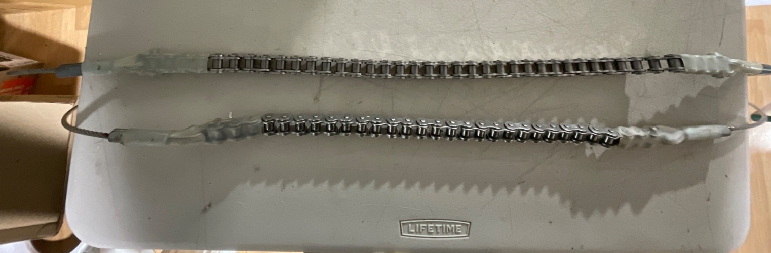 Never installed. All new parts.Pick from one of the two chains.A. 18” chain PEER 50SS. Cable 9’ from end of thimble.B. 24” chain ANSI 50-304. Cable 7’ from end of thimble.Pedestal is 30” high.