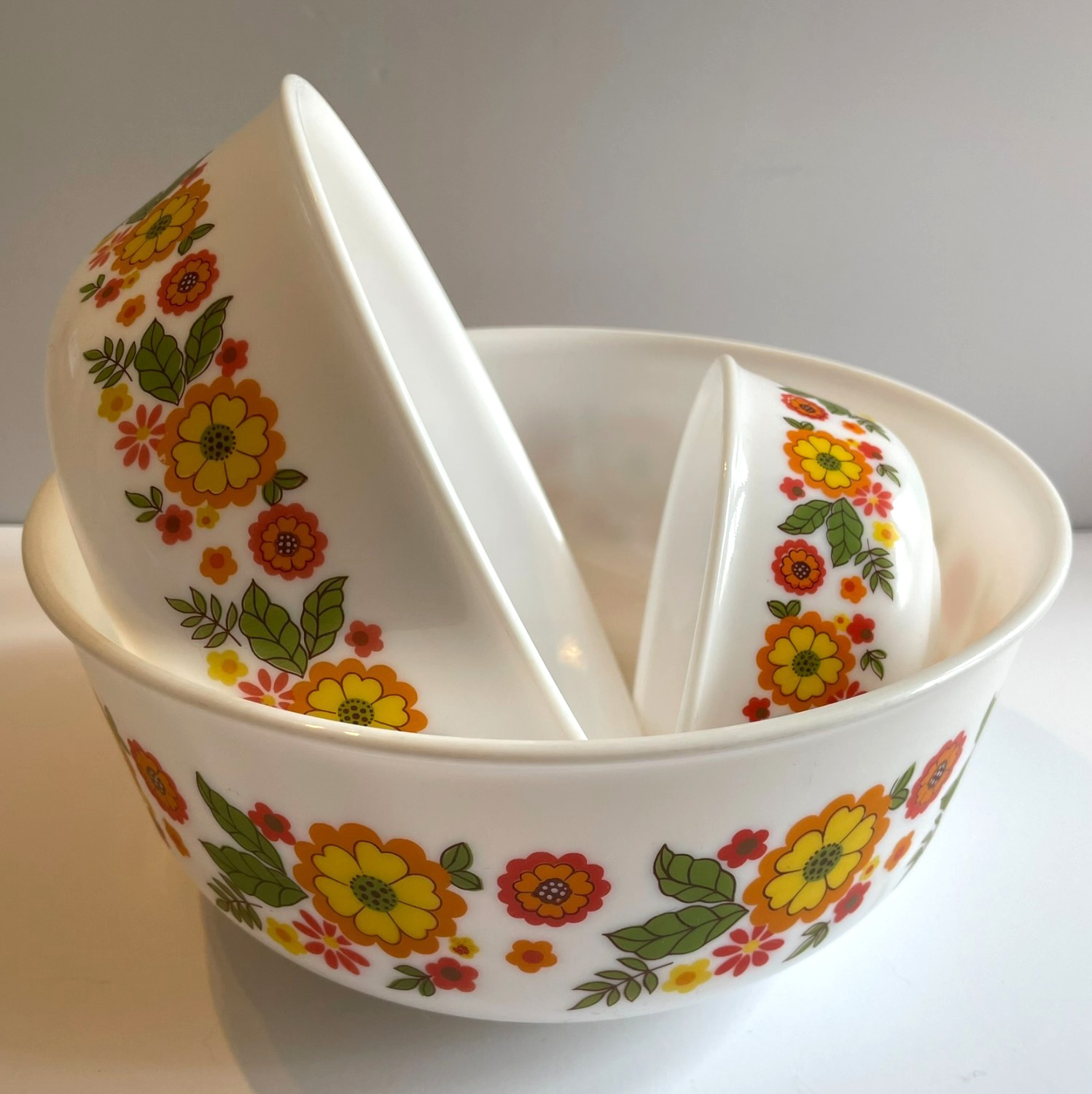 Vintage 1970s Arcopal France milk glass nesting / mixing bowls with a red, orange, yellow and green flower pattern. Sizes are 8.75 inches x 3.75 inches, 7 inches x 3 inches, 4.50 inches x 2 inches. There is no chips, cracks or roughage. The pattern is bright and bold. These bowl have seen some use and have some black smudge scratches to the insides. Please view photos. I have not tried to remove. Very hard to find seldom seen pattern!