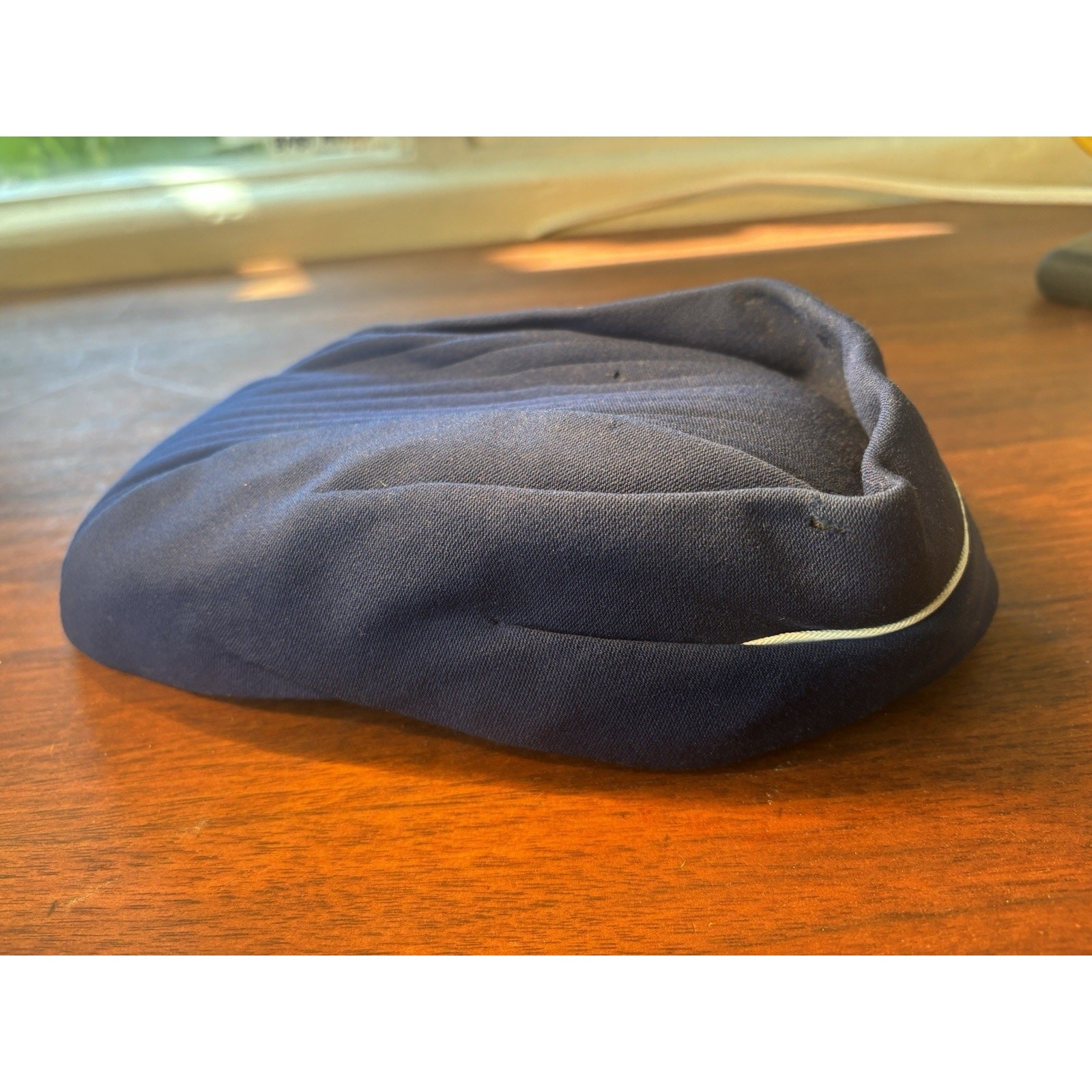 Authentic American Airlines stewardess cap and badge set from the early 1940s WWII era, designed by Mae Hanauer, Inc., 18 East 55th St., New York.• Cap Details:• Color: Dark navy blue with white soutache piping• Maker: Mae Hanauer Inc., New York (original woven interior label)• Size: 22• Original stewardess name on label: J. Crowne• Quilted pleat design, standard AA issue of the 1940s• Includes original tissue hat form, rare to find intact• Light service wear and small pinholes consistent with age and use• Badge Details:• Authentic American Airlines sterling silver cap badge• Right-facing eagle design, consistent with early AA issues (~1939–1944)• Screw-back fastener, marked STERLING• Likely made by Amcraft (Attleboro, MA), a known AA supplier during this era• Beautiful aged patina• Provenance:• Estate piece from AA Stewardess• Correct badge matched with correct cap• Complete with original hat holder/tissue form⸻Condition:• Cap: Excellent display condition for its age. Some light moth pinholes and storage wear as shown in photos. Interior label and stewardess name remain clear.• Badge: Strong detail, secure screw-back, natural silver patina.• Hat form: Original tissue insert included — exceptionally rare survivor.⸻Collector Note:Early AA stewardess uniforms are extremely scarce. Complete named sets with the correct sterling eagle badge and original hat form rarely appear on the market. This is a museum-quality piece of aviation history, suitable for display or collection.