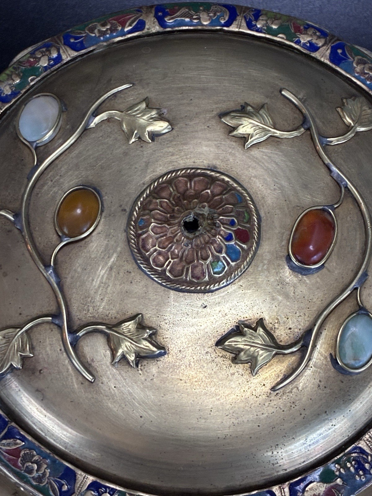 This Vintage Chinese Tea Caddy Box is a collectible item that showcases traditional Chinese culture and craftsmanship. Made of brass with enamel relief, it features intricate designs and natural stones, adding a touch of elegance and charm. Crafted in China, this tea caddy box is a unique piece that would make a lovely addition to any collection or as a unique decorative item in a home.