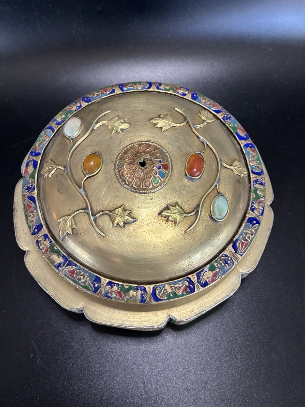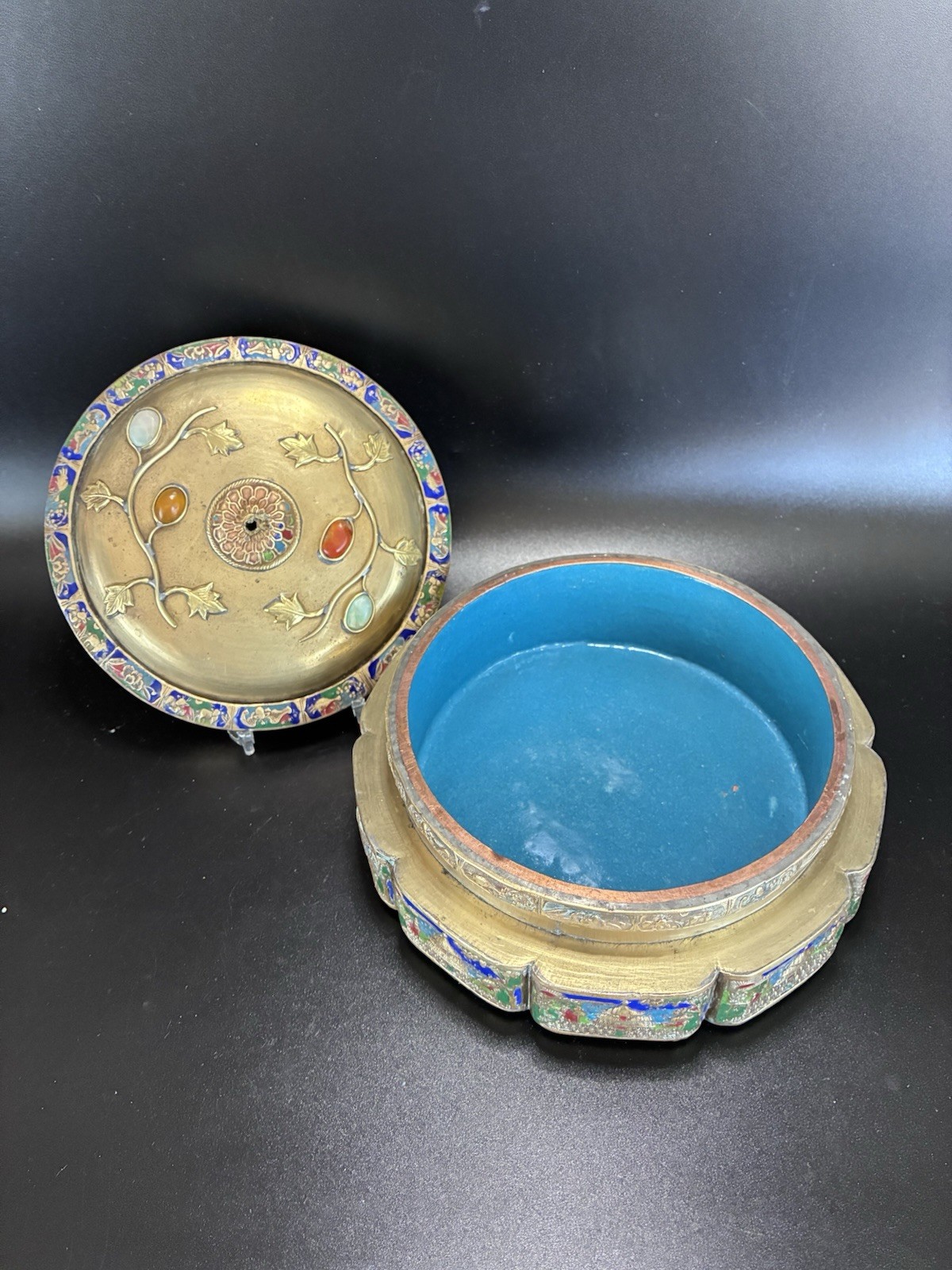 This vintage Chinese tea caddy box is a collectible storage piece featuring repousse brass and enamel relief detailing. The item is listed as used, so expect signs of age and wear consistent with previous ownership. The description does not provide full details on materials or any natural stone inlays, so check the listing for details. Free shipping is included, making it a convenient option for collectors or for decorative display.