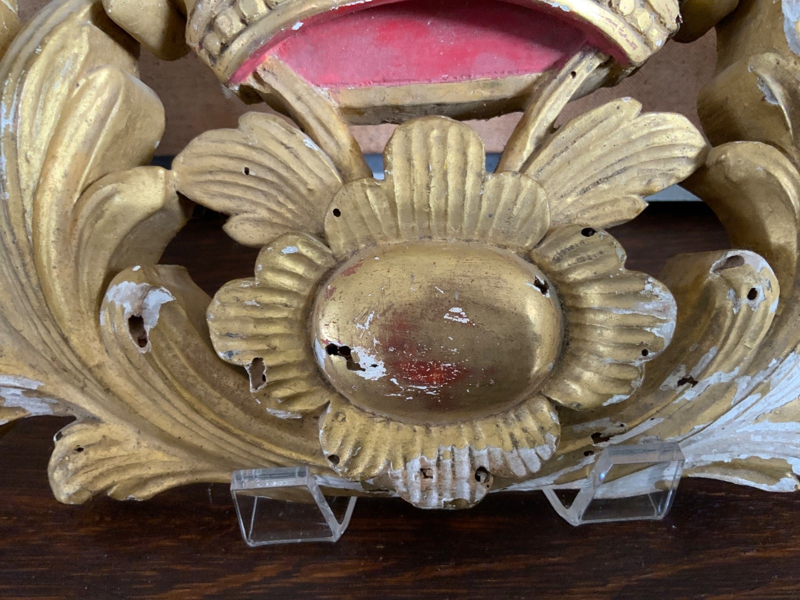 This 19th century French architectural gold gilt wood fragment is an antique decorative element sourced in France. It is hand carved and offered in good condition for its age, showing expected wear such as paint loss and old worm holes. Please review all listing photos to assess the true and final condition prior to purchase. Free shipping is included. Check the listing for details.