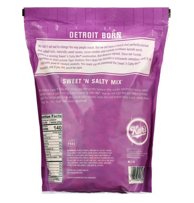 DescriptionKar's Original Sweet 'n Salty Mix brings your energy into balance! Why wonder whether your energy source should be sweet or salty? Just grab Kar's Sweet N Salty Mix. Your yin will high-five your yang in delicious fashion! Your tongue gets a ride on a flavor roller coaster, while iron and protein bring a sure, steady stream of energy. So. Yin? Yang? How about yummmm? Contains Milk, Peanuts and Soy. May Contain Tree Nuts. Partially produced with genetic engineering.America’s selling branded trail Mix!44oz. resealable packageGluten FreeKosher CertifiedKar's Sweet & Salty Trail Mix: Peanuts, Cocoa Candies, Raisins, Sunflower KernelsContains Milk, Peanuts and Soy. May Contain Tree Nuts. Partially produced with genetic engineering.