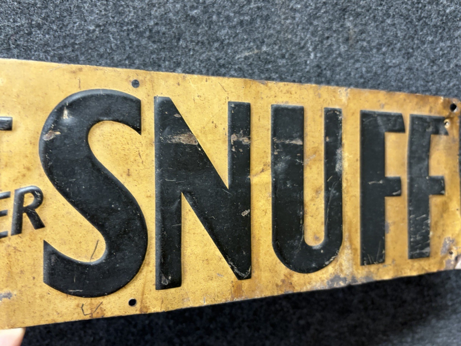 Antique 1910s 20s Navy Sweet Snuff Tobacco Embossed Tin Tacker Sign 22 5/8” Vtg. Antique sign in good-fair condition and shows wear consistent with age as seen . Some yellowing, wrinkles and surface wear . Metal pull through on bottom left corner mounting hole . Thin tin metal . See all photos for condition and measurements