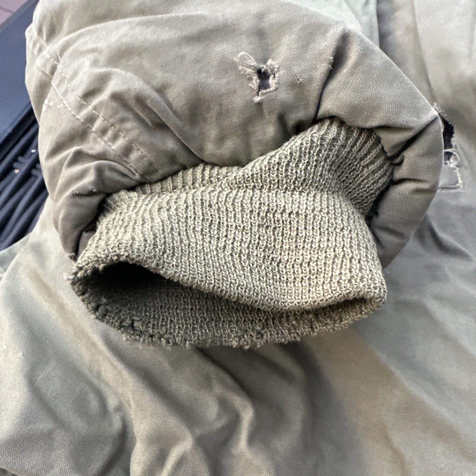 Korean War M43 field jacket liner. Identical to World War II model except for lining. Cuffs in collar are in super nice condition. The jacket has a few holes and a chair by the front pocket as shown. No tag tags. Nice example with great color.