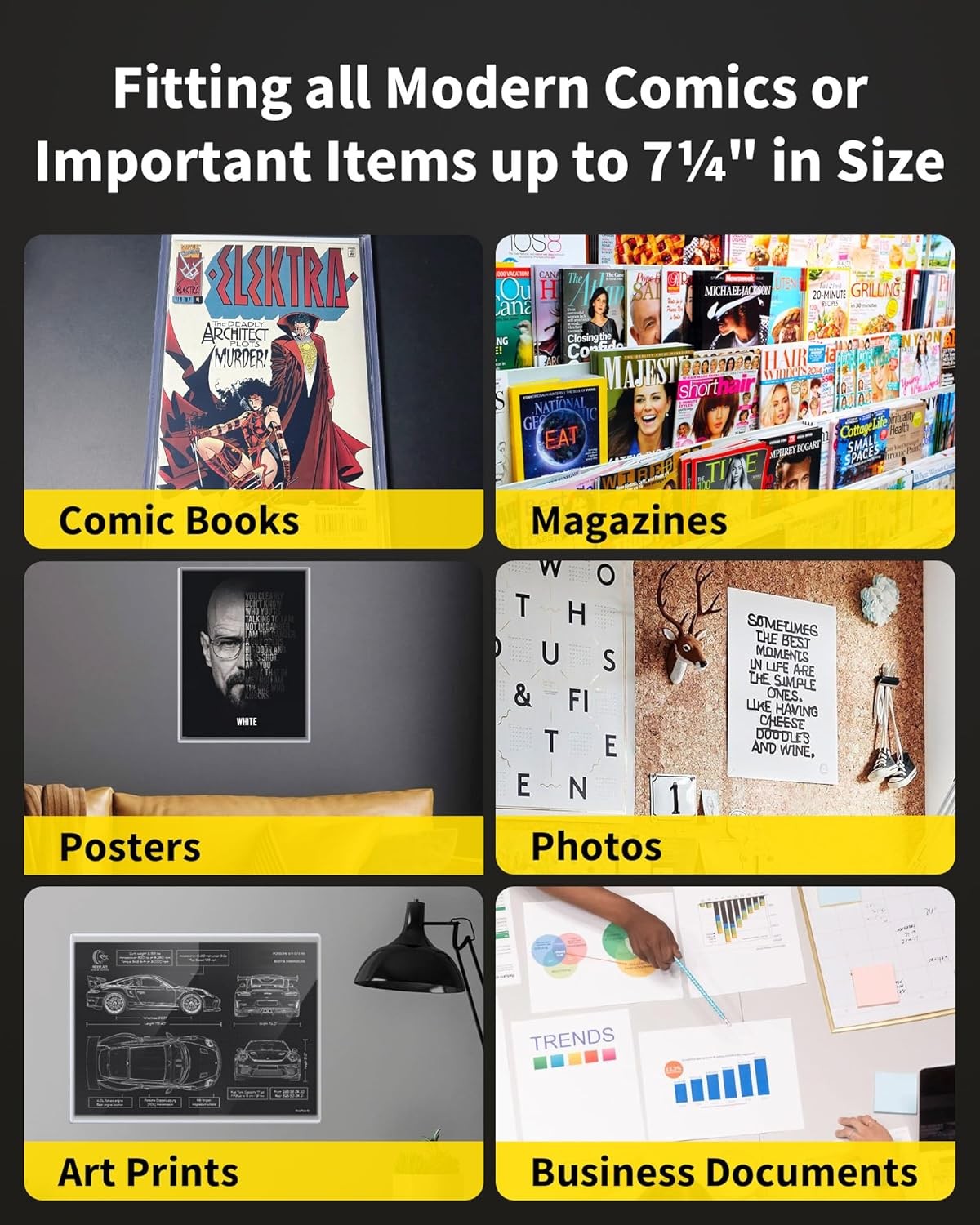 Material Plastic, Polyvinyl Chloride (PVC) Style Silver Comic Book Protector Item Weight 0.71 Kilograms Product Dimensions 11 x 7.63 x 0.1 inches Universe Marvel (MCU) MPN Does not apply Item Length 11 Compatible Thickness See Description Capacity See Description Item Height 0.1 inches Features Adjustable,Extra Clear,Foldable Compatible Size Standard Finish Clear Item Width 7.5 UPC Does not apply Ultimate Protection: Rigid comic book top loaders are designed to provide maximum protection for your valuable comics, preventing damage from dust, dirt, moisture, and handling. Perfect Fit: Exterior 7 5/8 in x 11 in x 1/4 in. Interior 7 1/4 in x 10 7/8 in x 3/16 in. Perfect for all standard-sized comic books, including modern/current, and silver age comics. Archival Safe: Made from Acid-Free, durable PVC that is clear and sturdy, ensuring your comics remain pristine for years. Easy to Use: The top-loading design of our comic book protectors allows for quick and easy insertion and removal of comics, making it a breeze to switch out your displays or access your collection. Ideal for Collectors: Whether you’re a seasoned collector or just starting your collection, our comic book top loaders are an essential tool for preserving the value of your comics.